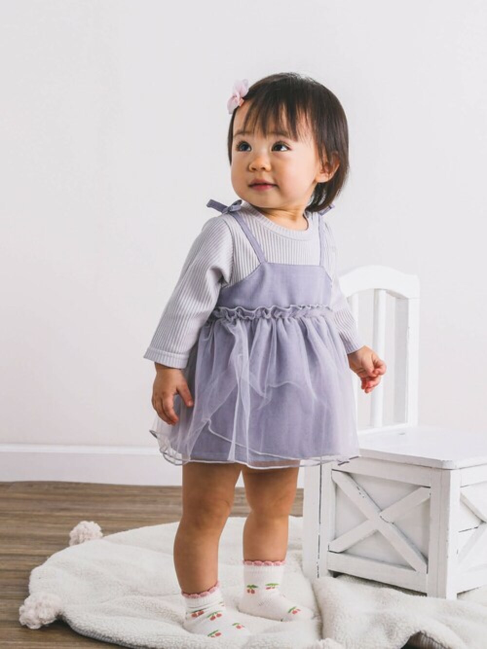 お姉ちゃんっぽいオシャレなデザインの長袖ロンパースにキュートなチェリー柄のソックスをコーディネート。 伸びのいいリブ素材に、キャミワンピをドッキングしたレイヤード風デザイン♪ 胸下フリルからふわっとチュールを重ねてキュートさをプラス♪ ロンパースっぽさをなくしたデザインで、ベビーもオシャレがかなうアイテムに仕上がりました。 かわいいピンクと上品なパープルの2色展開です。 おなかにスナップボタンがあたらないのでうつぶせ・ずりばいの時期のベビーにぴったり◎ 股下にはスナップが付いていて、足をバタバタしてもはだけにくく、オムツ替えもラクラクな設計です。 チェリー柄がキュートなベビーソックスは履き口に小さなフリルを添えて、女の子らしさをプラス♪ 靴下裏底には、星型の滑り止めつきで、たくさん動き回るベビーにも安心です◎ スタイやソックスはギフトのプラスワンとしても人気のアイテムです。 【SLAP SLIP(スラップ スリップ)】 ~子どもの欲しいをカタチに~ ヨーロッパのこどものように 子どもらしい今しか着れないナチュラルなかわいさを提案 どこか上品で清楚感漂うフレンチカジュアルは いつものコーディネートをさりげなく格上げ