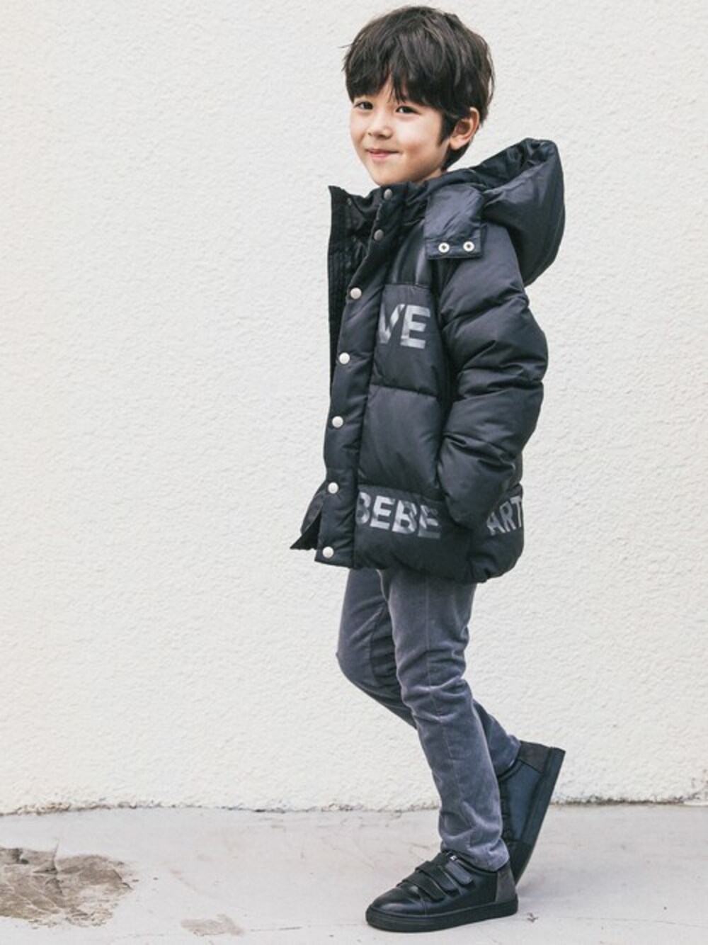 存在感のあるビッグロゴが映えるクールな表情のダウンが主役のブラックコーデ。 シンプルなアイテム同士の組合せも質感が異なるトレーナーや起毛感のあるパンツを取り入れて、こなれた表情に。 冬の街並みに映える、メンズライクなコーデに仕上げました。 【BeBe(べべ)】 ”LOVE MODERN” 少しおませで、生意気なヨーロピアンカジュアルの提案。 時代性・流行性をとらえ、ベーシックでもワンポイントを施した遊び心、楽しさを盛り込んでいます。 シンプルだけど、こだわりのあるオリジナリティーを重視しています。