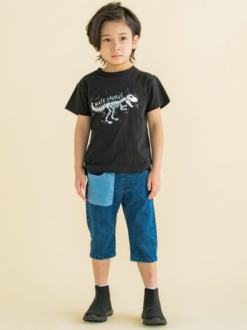 男の子に大人気恐竜柄のTシャツ!! メタリックプで光の当たり方で表情が変わるかっこいいプリント♪ バックプリントにも恐竜がたくさんいるんです。 ポケットデザインが個性的なデニムパンツでおしゃ見えコーデ。 【 WASK(ワスク)】 WEEAGEDSAUCYKID「我々は小生意気な子供である・・・」 自由で遊び心満載な男の子たちへ アメリカンテイストをベースにその時々のトレンドや異なる要素をプラス エッジの効いたカジュアルスタイルをキッズウェアで表現