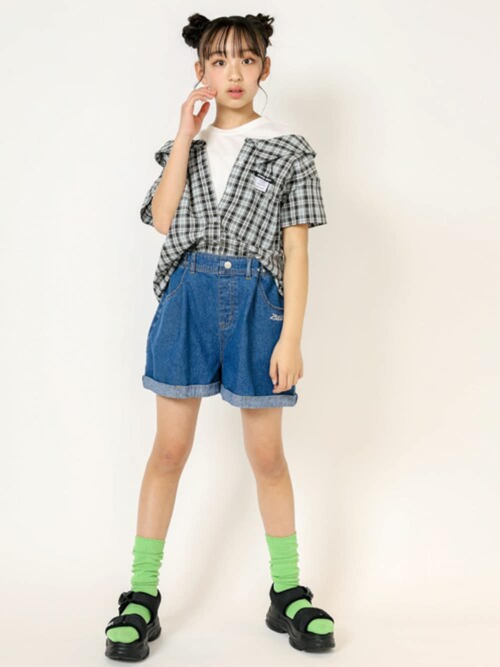 シャツの中にTシャツを着ているかのようなフェイクレイヤードデザインが魅力のチェックシャツ。 ウエストホックごポイントのワイドデニムショートパンツとコーディネート。 ざっくりとしたコットン100%の平織り生地で、こなれ感あるルックに仕上げた一枚です。 お色は落ち着いた色味のブラック×爽やかなブルー(ブラック)と、自然な色合いのブラック×ブラウン(ベージュ)の2色。 胸にはアクセントになるチェーン付きネームをつけました。 後ろ姿も気を抜かず、インパクトのあるロゴチケットのパッチワーク付き。 ショートパンツ合わせでリラックススタイルも完璧! 今っぽいトレンドのドロップショルダーで一枚でスタイリングがキマる優れたアイテムです。 ☆2023年 ZIDDY 春夏コレクションテーマ☆ 《MYSTYLE》昨年からのY2Kファッションの要素を残しつつ、自由な発想から生まれたストリートファッションやトレンドの韓国っぽさを取り入れたスタイルを提案。 明るくポジティブな遊び心のあるカラーでPOPなアイテムが揃います。 【ZIDDY(ジディー)】 FOR FASHIONABLE GIRLS ~オシャレが好きな女の子を応援~ レディース・ティーンズトレンドを取り入れた、女の子の“今”に寄り添うファッションブランド ティーンズ心ときめく要素を詰め込んだ商品を展開し、女の子のオシャレを応援
