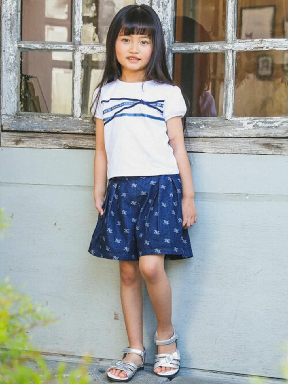 ホワイト×ネイビーのさわやかなカジュアルコーデ。 タックを入れてふんわりとさせた女の子らしいシルエットに、シックなモノグラム柄を組み合わせたショートパンツはトレンド感満載。 同じネイビーをアクセントに使ったTシャツと合わせて統一感のある仕上がりに。 胸元に斜めに入ったリボンデザインも全体をシャープにまとめてくれます。 シックなテイストと女の子らしい甘さをバランス良く取り入れた、カジュアルになりすぎない夏コーデがおすすめです。 【BeBe(べべ)】 ”LOVE MODERN” 少しおませで、生意気なヨーロピアンカジュアルの提案。 時代性・流行性をとらえ、ベーシックでもワンポイントを施した遊び心、楽しさを盛り込んでいます。 シンプルだけど、こだわりのあるオリジナリティーを重視しています。