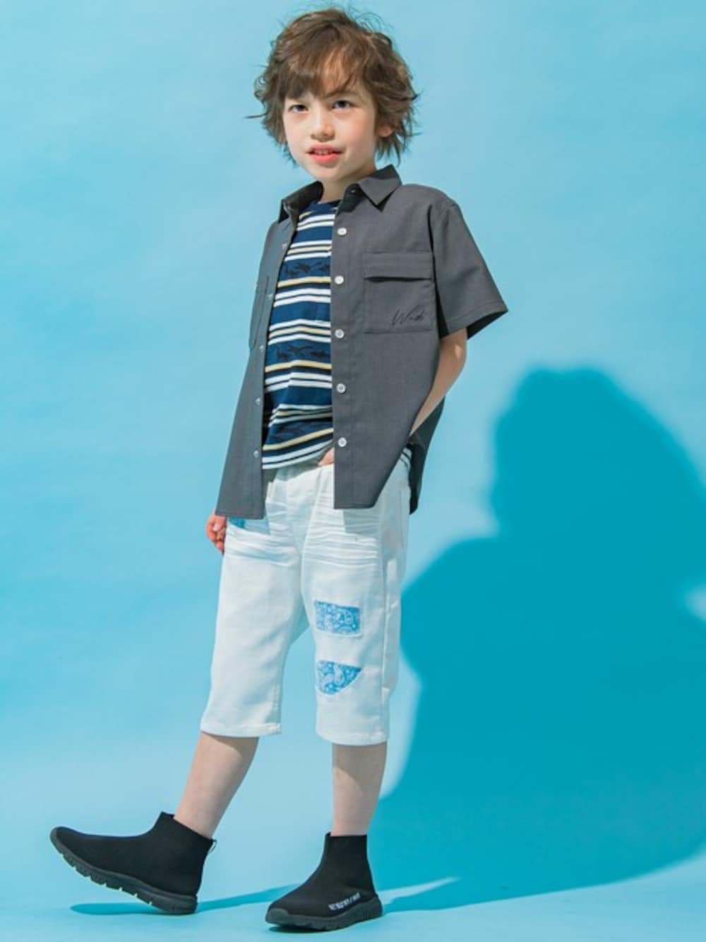 どこかレトロ感のあるアメカジコーデ。 ジャガードのMIXボーダーTシャツに、 ダメージ部分のパッチにペイズリー柄の生地を使ったデニムパンツ。 とろみ感のあるシャツを合わせて今っぽさもプラス。 コンパクトなシルエットでカジュアルアイテムをきれいにまとめています。 サイズアップすればストリートっぽさのあるコーデにも♪ 個性もありつつベーシックカラーでコーデしやすいアイテムです。 【 WASK(ワスク)】 WEEAGEDSAUCYKID「我々は小生意気な子供である・・・」 自由で遊び心満載な男の子たちへ アメリカンテイストをベースにその時々のトレンドや異なる要素をプラス エッジの効いたカジュアルスタイルをキッズウェアで表現