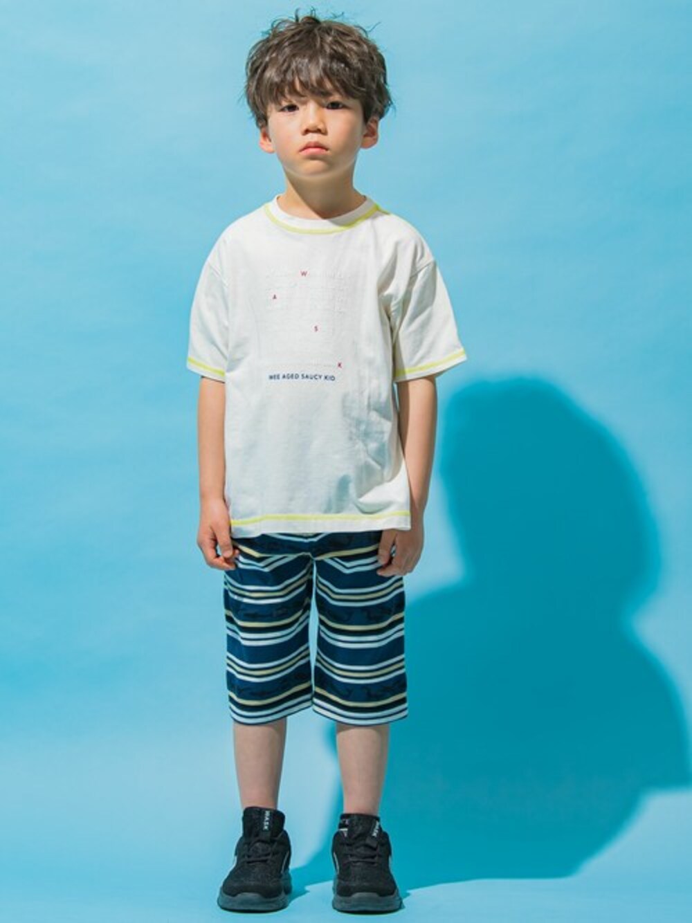 爽やかなネイビー×ホワイトのカラーがマリン風な夏コーデ。 アメカジ古着のディテールを今風のカラーリングに落とし込んだ、 カラーステッチが特徴的なビッグシルエットTシャツ。 フロントのスペルプリントは立体的な厚盛プリントという手法を採用し、「W」「A」「S」「K」の4文字を配色にすることでブランドロゴが浮かび上がるような、遊び心溢れるデザインです。 ボトムのボーダーの中にはさりげなく海の生き物が織り込まれています。 しっかり見れば見る穂と面白味のあるアイテムのコーデです。 【 WASK(ワスク)】 WEEAGEDSAUCYKID「我々は小生意気な子供である・・・」 自由で遊び心満載な男の子たちへ アメリカンテイストをベースにその時々のトレンドや異なる要素をプラス エッジの効いたカジュアルスタイルをキッズウェアで表現