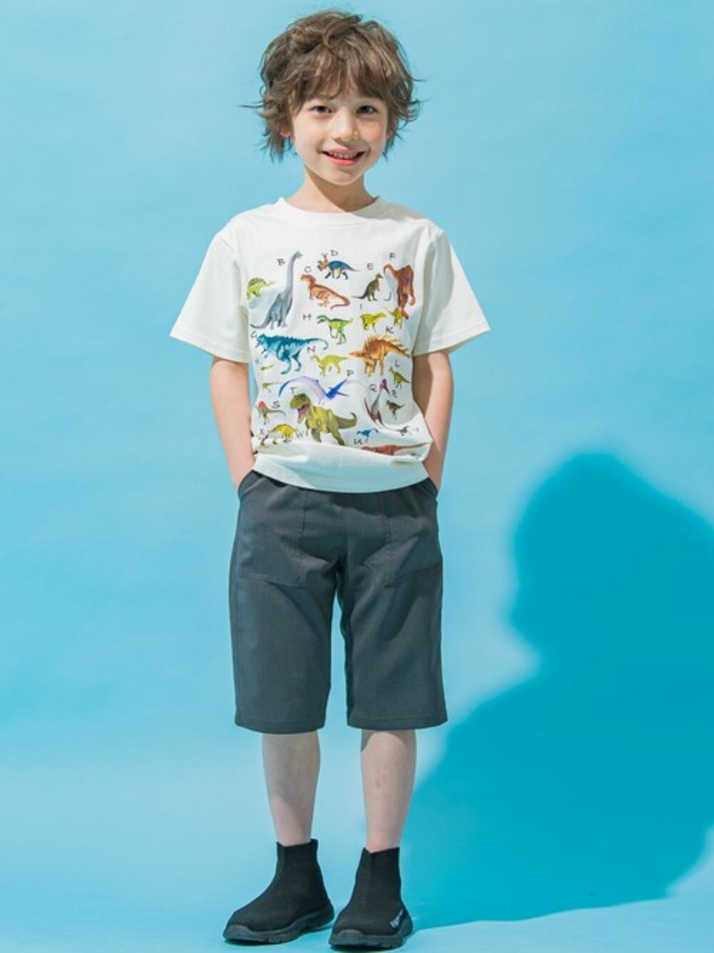 BEBE ONLINE STORE(BEBE ONLINE STORE)のTシャツ/カットソー「【接触冷感】恐竜アルファベットTシャツ(100~160cm)」を使ったコーディネート
