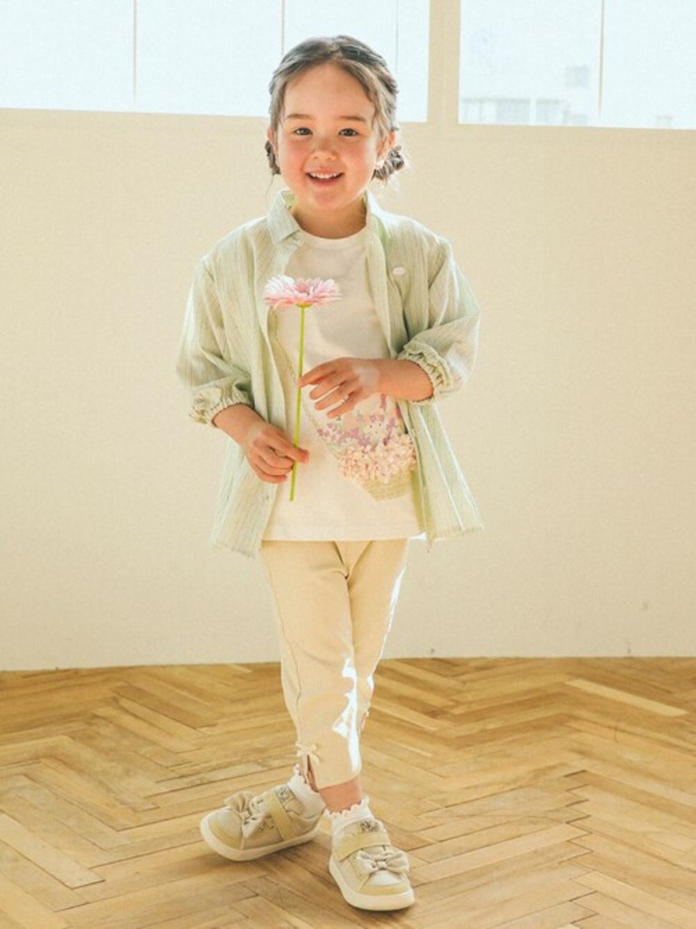 カゴのポシェットを肩から下げているようなプリントが可愛い半袖Tシャツに7分袖のシャツにスパーストレッチ素材のシンプルなデザインのパンツを合わせた春夏にピッタリなさわやかコーデ。 上に羽織った7分袖のシャツはタックを入れてちょっとウエストを絞ったオシャレなデザイン。 いつものコーデにシャツを羽織れば、休日コーデにアップデート! 同じ柄の生地を使用した男の子用アイテム、ベビー用アイテムの展開があるのでお揃いコーディネートで家族のお出かけが楽しくなること間違いなし! 【ストライプ柄シリーズ】 「キッズ」 女の子用シャツ(1806-52507) 男の子用シャツ(1806-52529) 「ベビー」 ワンピース+ブルマセット(1822-52505) 2023年春夏女の子アイテム。 【SLAP SLIP(スラップ スリップ)】 ~子どもの欲しいをカタチに~ ヨーロッパのこどものように 子どもらしい今しか着れないナチュラルなかわいさを提案 どこか上品で清楚感漂うフレンチカジュアルは いつものコーディネートをさりげなく格上げ