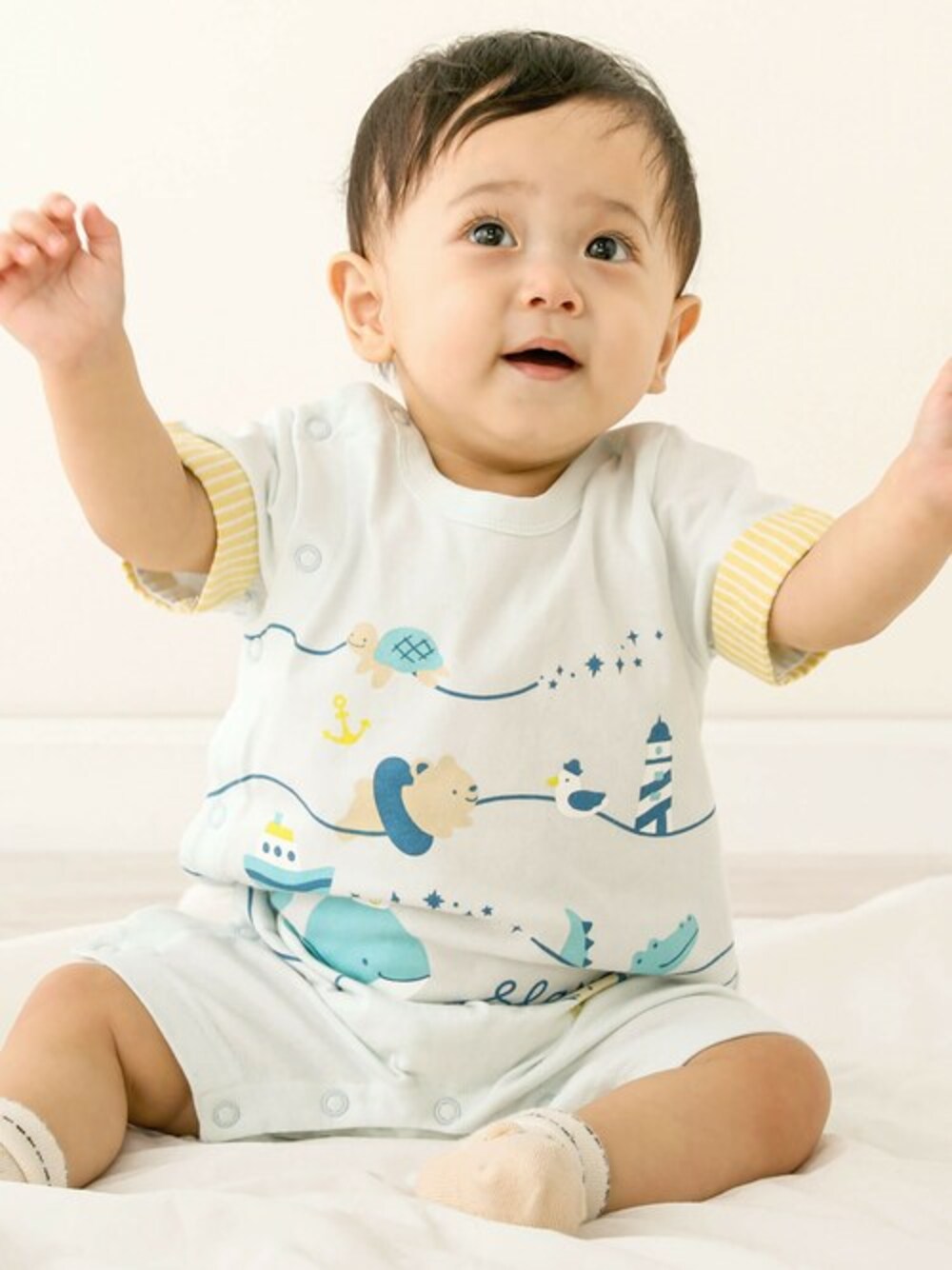 BEBE ONLINE STORE(BEBE ONLINE STORE)のロンパース「うみのいきものぷかぷか半袖ロンパースベビー(60~80cm)」を使ったコーディネート