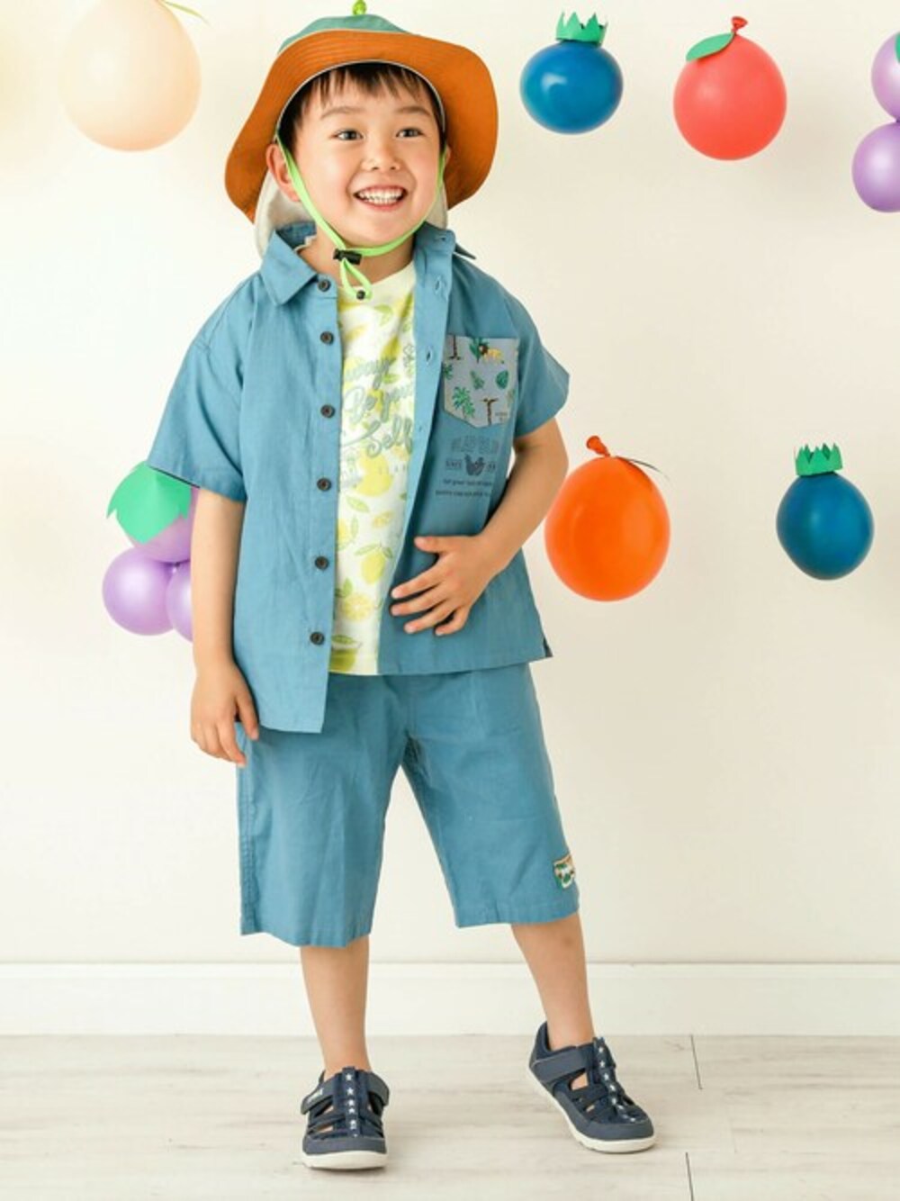 みんな大好きフルーツ柄のTシャツにサファリ柄のシャツと同じ生地を使用したパンツをコーディネート。 セットアップのコーデにフルーツ柄が映えるスタイリングになっています。 カラフルな切り替えのサファリハットも併せて気分は探検隊!? シャツ、パンツ、半袖Tシャツはそれぞれお揃いアイテムも展開しているのでお出かけ用のお揃いコーデも◎ <サファリ柄シリーズ-シャツ・パンツ- 【キッズ】 男の子用シャツ(1806-53014) 男の子用パンツ(1810-53132) 男の子用サロペット(1817-53027) 【ベビー】 男の子用ロンパース(1837-53063) <フルーツ柄シリーズ-半袖Tシャツ- 【キッズ】 男の子用Tシャツ(1815-53148) 女の子用Tシャツ(1815-53036) 女の子用ワンピース(1801-53019) 【ベビー】 男の子用ロンパース(1837-53085) 女の子用ロンパース(1837-53041) 【SLAP SLIP(スラップ スリップ)】 ~子どもの欲しいをカタチに~ ヨーロッパのこどものように 子どもらしい今しか着れないナチュラルなかわいさを提案 どこか上品で清楚感漂うフレンチカジュアルは いつものコーディネートをさりげなく格上げ