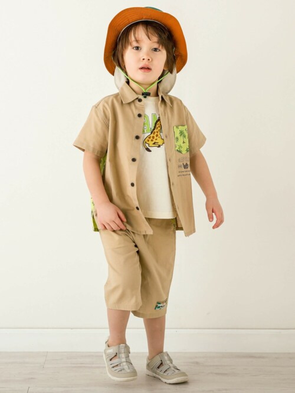 同じ生地を使用した上下のセットアップにカラーごとに異なるパッチ刺しゅうがポイントの半袖Tシャツを合わせました。 今にも大冒険に出発したくなるお出かけコーデ。 カラフルな切り替えのサファリハットも併せて気分は探検隊!? お揃いアイテムも展開しているのでお出かけ用のお揃いコーデもオススメ◎ <サファリ柄シリーズ-シャツ・パンツ- 【キッズ】 男の子用シャツ(1806-53014) 男の子用パンツ(1810-53132) 男の子用サロペット(1817-53027) 【ベビー】 男の子用ロンパース(1837-53063) 【SLAP SLIP(スラップ スリップ)】 ~子どもの欲しいをカタチに~ ヨーロッパのこどものように 子どもらしい今しか着れないナチュラルなかわいさを提案 どこか上品で清楚感漂うフレンチカジュアルは いつものコーディネートをさりげなく格上げ