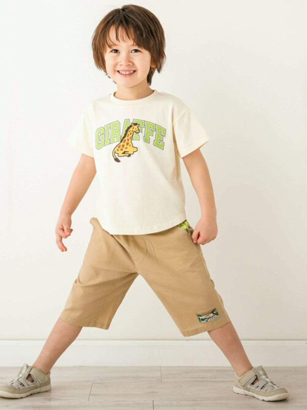 パッチ刺繍がカッコいい半袖Tシャツに通気性のいい綿麻素材を使用したデイリーコーデ。 カラーごとに異なるパッチ刺繍はオフホワイト(キリン)、ブルー(シマウマ)、オレンジ(チーター)の3種類から選べるよ。 後ろにはジャングルに生い茂っているような木々からいろんなアニマルが顔を出しているデザインのプリントをオン。 バックスタイルもカッコよく決まる1着。 今にも動き出しそうなアニマルたちと一緒に夏のデイリーを満喫! パンツと同じ生地を使用したサファリ柄プリントシリーズの展開があるので兄弟のシミラーコーデも可能です◎ お揃いコーディネートで家族のお出かけが楽しくなること間違いなし! 【キッズ】 男の子用シャツ(1806-53014) 男の子用パンツ(1810-53132) 男の子用サロペット(1817-53027) 【ベビー】 男の子用ロンパース(1837-53063) 【SLAP SLIP(スラップ スリップ)】 ~子どもの欲しいをカタチに~ ヨーロッパのこどものように 子どもらしい今しか着れないナチュラルなかわいさを提案 どこか上品で清楚感漂うフレンチカジュアルは いつものコーディネートをさりげなく格上げ