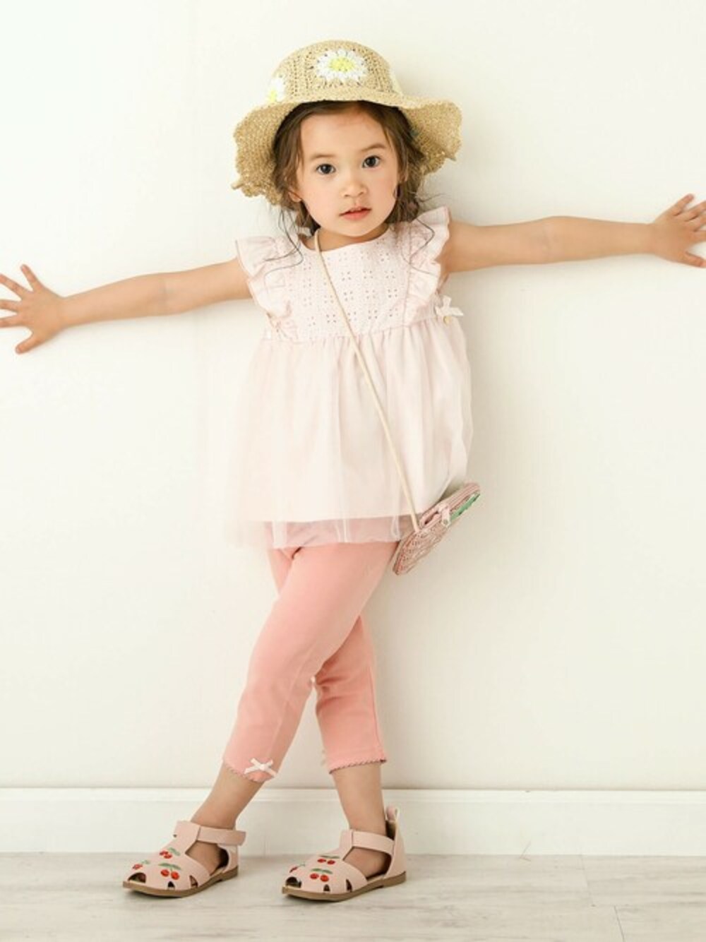 レースとチュールの切り替えがキュートなチュニックにシンプルで合わせやすいレギンス、イチゴ柄のポシェットとチェリーモチーフのサンダルを合わせました。 ピンクで統一した女の子らしいコーディネート。 少しずつテイストの異なるピンクになっているので甘くなりすぎないのがポイント。 軽くしなやかなペーパー素材でお子様も被りやすいハットも合わせて、ガーリーだけど動きやすいアクティブなキッズにピッタリな夏コーデ。 ちょっとしたお出かけやデイリーコーデにおすすめです。 チュニックと同柄を使用したベビーサイズのロンパース(1837-53029)やスタイ(1834-53015)を展開しているので姉妹・お友達と合わせたお揃いコーデ・シミラーコーデも可能になっています。 【SLAP SLIP(スラップ スリップ)】 ~子どもの欲しいをカタチに~ ヨーロッパのこどものように 子どもらしい今しか着れないナチュラルなかわいさを提案 どこか上品で清楚感漂うフレンチカジュアルは いつものコーディネートをさりげなく格上げ