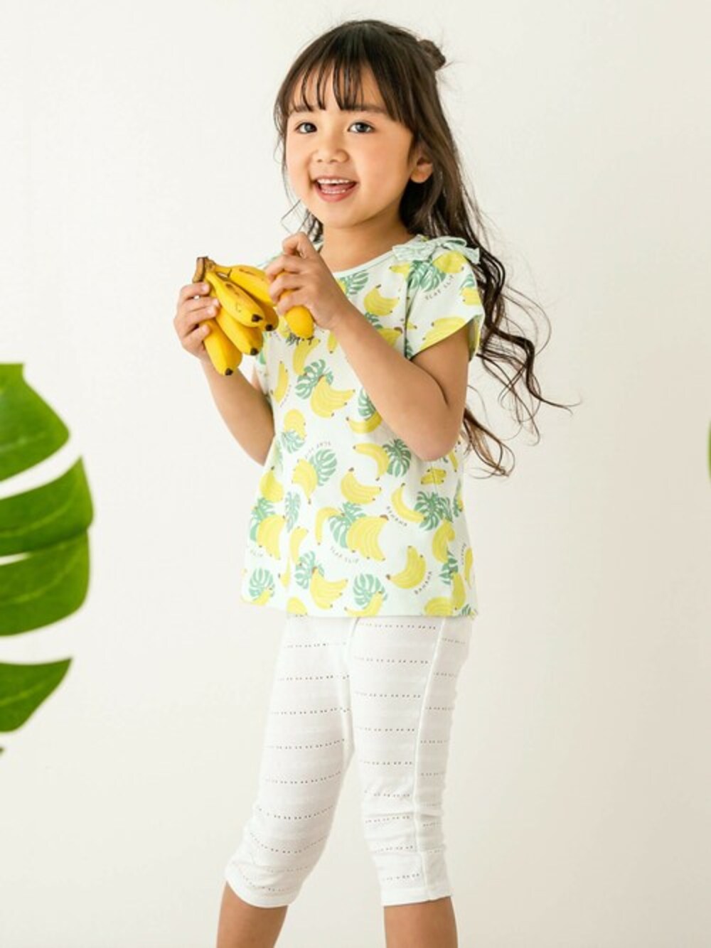 みんな大好き!大人気のフルーツ柄を使用した半袖Tシャツに春夏のデイリー使いに活躍する6分丈のレギンスをコーディネート。 Tシャツは元気いっぱいのキッズにピッタリなカラフルな柄で夏を満喫◎ フルーツ柄はカラーごとに異なるのでお気に入りのフルーツを選んでね。 レッド系:イチゴをメインにチェリーやベリーをMIXしたフルーツ柄 ネイビー系:パイン柄 イエロー系:レモン柄 グリーン系:バナナ柄 肩口にリボン、胸元にはキラッと輝くラメ糸の刺しゅうをほどこして女の子らしさがぎゅぎゅっと詰まったアイテムになっています。 襟ぐりにゴムが入っているので一人でお着替えできるのもキッズがうれしいポイント。 フルーツ柄プリントシリーズの展開があるので姉妹のシミラーコーデも可能です◎ お揃いコーディネートで家族のお出かけが楽しくなること間違いなし! 【キッズ】 男の子用Tシャツ(1815-53148) 女の子用Tシャツ(1815-53036) 女の子用ワンピース(1801-53019) 【ベビー】 男の子用ロンパース(1837-53085) 女の子用ロンパース(1837-53041) レギンスのおしりにフリルをほどこしてバックスタイルが女の子らしいキュートなデザインに仕上げました。 足元にも華やかさも忘れずに。お花モチーフのサンダルで可愛さをプラス。 【SLAP SLIP(スラップ スリップ)】 ~子どもの欲しいをカタチに~ ヨーロッパのこどものように 子どもらしい今しか着れないナチュラルなかわいさを提案 どこか上品で清楚感漂うフレンチカジュアルは いつものコーディネートをさりげなく格上げ