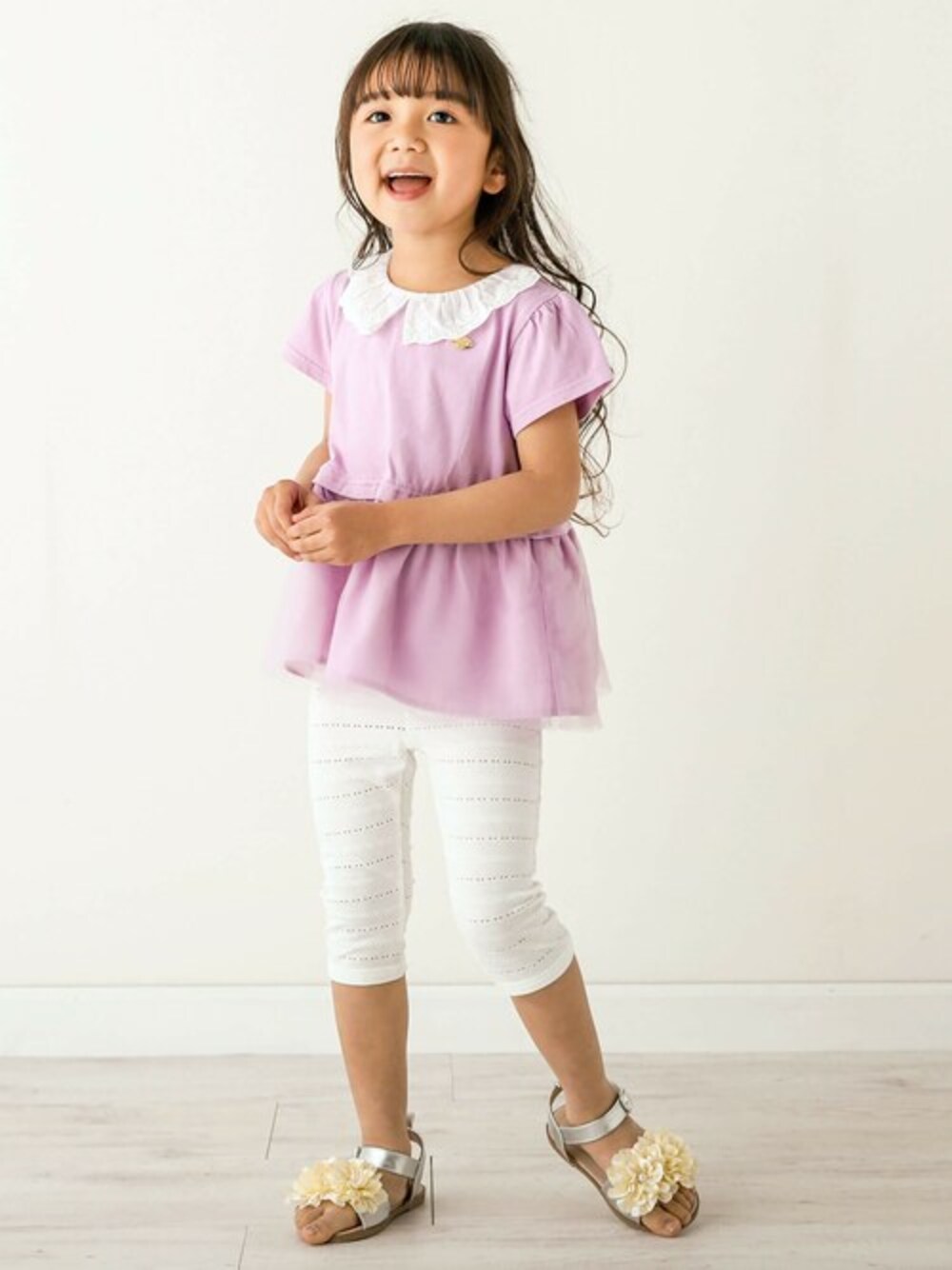 切り替えのチュールが可愛い半袖Tシャツに春夏のデイリー使いに活躍する6分丈のレギンスをコーディネート。 襟ぐりにあしらったレースを使った襟やウエストのフリルに2枚重ねたチュールがカジュアルなデザインのTシャツで女の子らしいキュートさを演出します。 胸元にほどこしたゴールドのチャームは、キラッと輝くオシャレなポイント。 チュールの透け感が涼し気で、春夏のおでかけにピッタリな1着になっています。 後ろ襟ぐりにゴムが入っているので、一人でお着替えできるのもキッズがうれしいポイント。 同じ柄の赤ちゃんサイズのロンパース(1837-53007)も展開しているので姉妹・お友達とのシミラーコーデもオススメです。 レギンスのおしりにフリルをほどこしてバックスタイルが女の子らしいキュートなデザインに仕上げました。 足元にも華やかさも忘れずに。お花モチーフのサンダルで可愛さをプラス。 【SLAP SLIP(スラップ スリップ)】 ~子どもの欲しいをカタチに~ ヨーロッパのこどものように 子どもらしい今しか着れないナチュラルなかわいさを提案 どこか上品で清楚感漂うフレンチカジュアルは いつものコーディネートをさりげなく格上げ