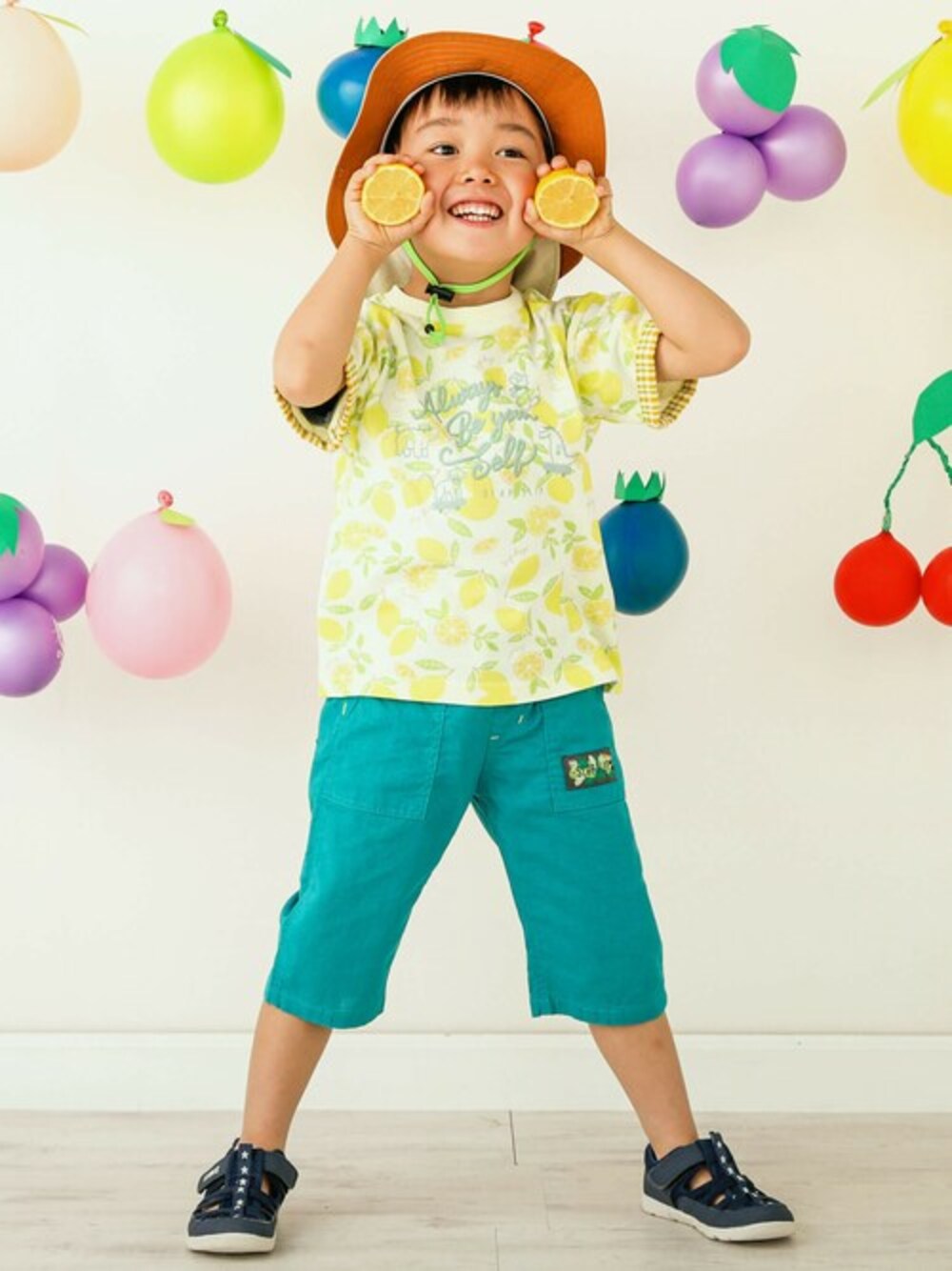 みんな大好き!大人気のフルーツ柄を使用した半袖Tシャツに春夏のデイリー使いに大活躍する6分丈のパンツをコーディネート。 サファリハットも合わせて日よけ対策もバッチリ◎ 元気いっぱいのキッズにピッタリなカラフルなトップスで夏を満喫! フルーツ柄はカラーごとに異なるのでお気に入りのフルーツを選んでね。 レッド系:スイカ柄 ネイビー系:パイン柄 イエロー系:レモン柄 グリーン系:バナナ柄 袖口を折り返すとチェックの生地が見えるのがオシャレなアイテム。 フロントには春夏を満喫しているアニマルたちをプリント。 カラーによって印象が異なるパンツはデイリーユース用に何枚も持っておきたいアイテムの1つ。 パンツの生地には綿麻素材を使用しているので通気性がよく、気温が上がってくる春夏でもさわやかに着こなせるのがうれしいポイント◎ 今年の春夏は足首を出してすっきりしたさわやかコーデに決まり! 【SLAP SLIP(スラップ スリップ)】 ~子どもの欲しいをカタチに~ ヨーロッパのこどものように 子どもらしい今しか着れないナチュラルなかわいさを提案 どこか上品で清楚感漂うフレンチカジュアルは いつものコーディネートをさりげなく格上げ
