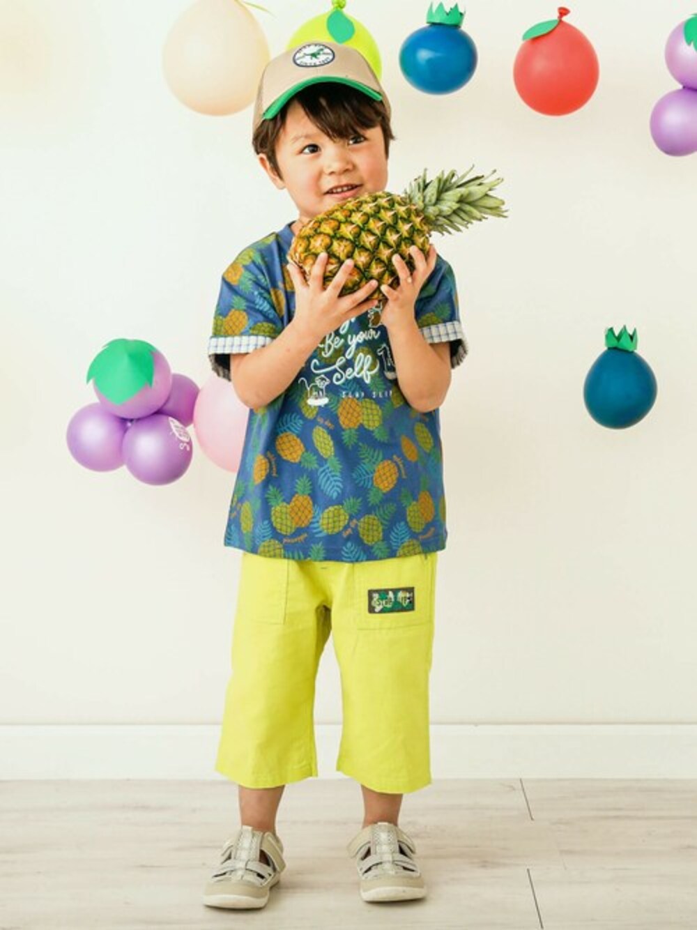 みんな大好き!大人気のフルーツ柄を使用した半袖Tシャツに春夏のデイリー使いに大活躍する6分丈のパンツをコーディネート。 サファリハットも合わせて日よけ対策もバッチリ◎ 元気いっぱいのキッズにピッタリなカラフルなトップスで夏を満喫! フルーツ柄はカラーごとに異なるのでお気に入りのフルーツを選んでね。 レッド系:スイカ柄 ネイビー系:パイン柄 イエロー系:レモン柄 グリーン系:バナナ柄 袖口を折り返すとチェックの生地が見えるのがオシャレなアイテム。 フロントには春夏を満喫しているアニマルたちをプリント。 カラーによって印象が異なるパンツはデイリーユース用に何枚も持っておきたいアイテムの1つ。 パンツの生地には綿麻素材を使用しているので通気性がよく、気温が上がってくる春夏でもさわやかに着こなせるのがうれしいポイント◎ 今年の春夏は足首を出してすっきりしたさわやかコーデに決まり! 【SLAP SLIP(スラップ スリップ)】 ~子どもの欲しいをカタチに~ ヨーロッパのこどものように 子どもらしい今しか着れないナチュラルなかわいさを提案 どこか上品で清楚感漂うフレンチカジュアルは いつものコーディネートをさりげなく格上げ