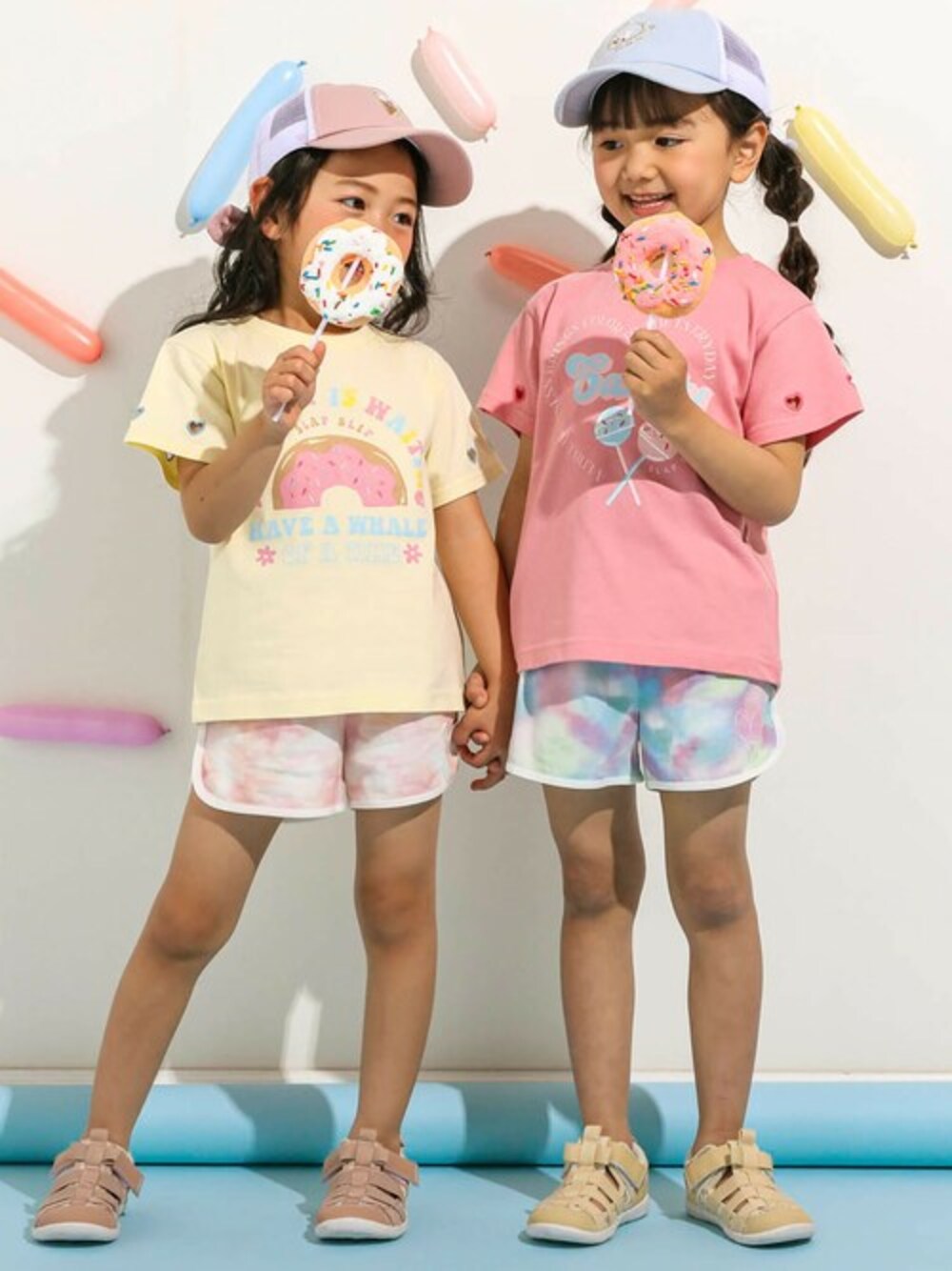 ハートのくり抜きがキュートで女の子が大好きなPOPなスイーツをプリントした半袖Tシャツにインパクトのあるタイダイ柄のショートパンツを合わせたスポーティーなコーディネート。 Tシャツにプリントされた女の子が大好きな甘いスイーツはカラーごとに異なります。 イエロー:ドーナツ ピンク:ロリポップキャンディー グリーン:アイス お気に入りのスイーツプリントを着て夏のお出かけを楽しんでね! プリントの一部には刺しゅうをほどこしてさりげない立体感があるのもキュートなポイント。 縁にほどこしたパイピングがオシャレなアイテムになっています。 レギンスを合わせたスポーティーなコーデもオススメ◎ ウエストがゴム仕様になっているので着脱簡単なのもうれしいポイント。 付属品がなく、お手入れもラクラクでママもニコニコ。 夏のお出かけはもちろん、デイリー使いにもオススメの1着です。 キャップも合わせて日よけ対策もバッチリな夏コーデの完成◎ お友達や姉妹で合わせたお揃いコーデもおすすめです。 【SLAP SLIP(スラップ スリップ)】 ~子どもの欲しいをカタチに~ ヨーロッパのこどものように 子どもらしい今しか着れないナチュラルなかわいさを提案 どこか上品で清楚感漂うフレンチカジュアルは いつものコーディネートをさりげなく格上げ