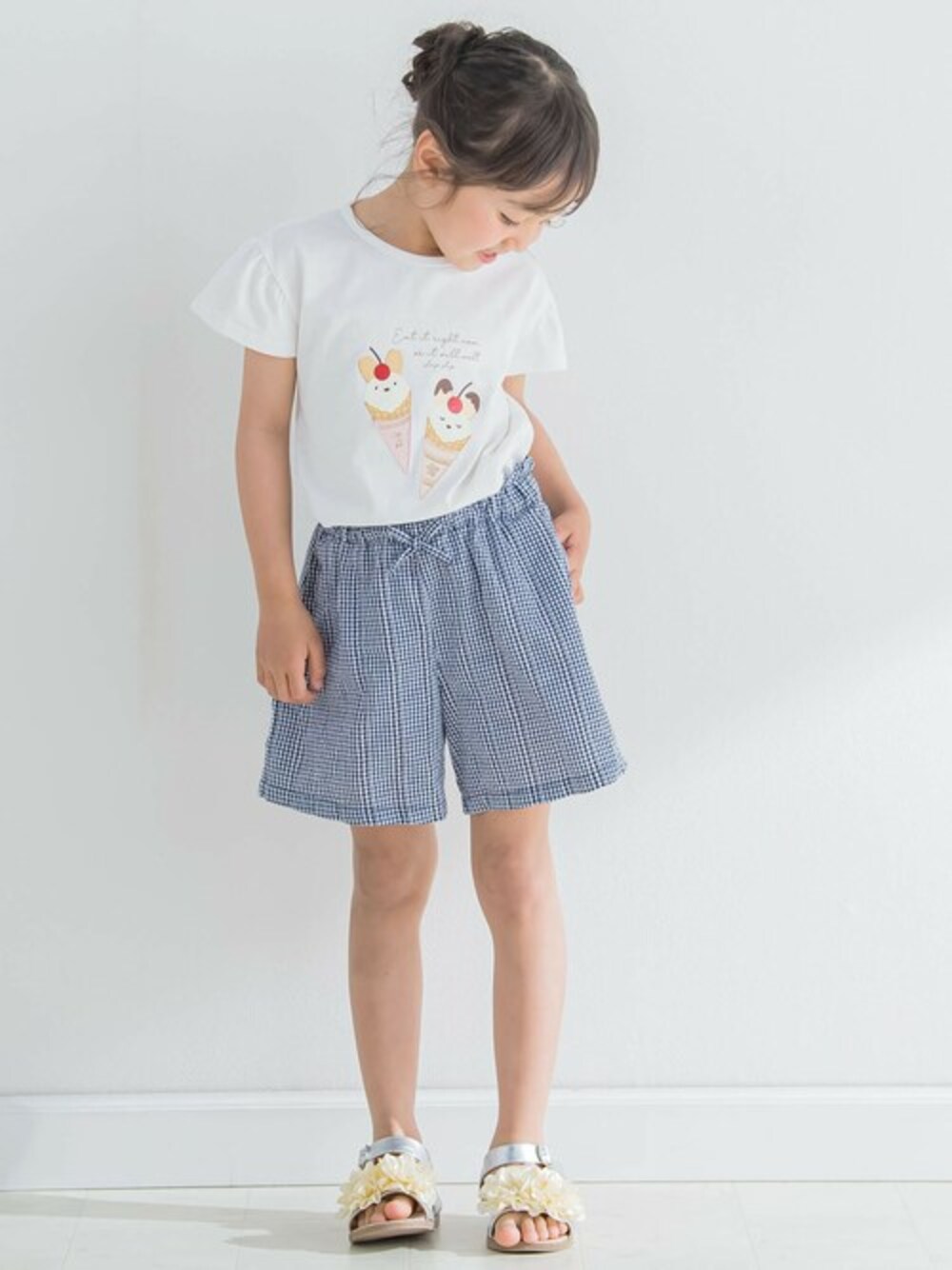 プリントと刺しゅうであしらったウサギさんのアイスモチーフがキュートなTシャツにチェック柄のショートパンツを合わせました。 ウサギさんの頭に乗ったチェリーはグリッター、刺しゅうにはラメ糸を使用しているので動くたびにきらっと輝くおしゃれなトップスは 袖に寄せたギャザーが周りと差がつくアクセントになっています。 デイリー使いはもちろん、夏のお出かけにもおすすめ◎ 幅広く活躍するアイテムなのでワードロープに入れておきたい1着です。 合わせたショートパンツはレース素材を使用しているのでちょっとおめかししたい時にピッタリ◎ ギンガムチェックにほどこされたストライプのレースがおしゃれなアイテム。 ウエストにはゴムを使用しているのでお着換えラクチンでママもキッズもニッコニコ。 おねえさんが履いているようなサンダルを合わせて夏のお出かけを楽しんでね! 【SLAP SLIP(スラップ スリップ)】 ~子どもの欲しいをカタチに~ ヨーロッパのこどものように 子どもらしい今しか着れないナチュラルなかわいさを提案 どこか上品で清楚感漂うフレンチカジュアルは いつものコーディネートをさりげなく格上げ