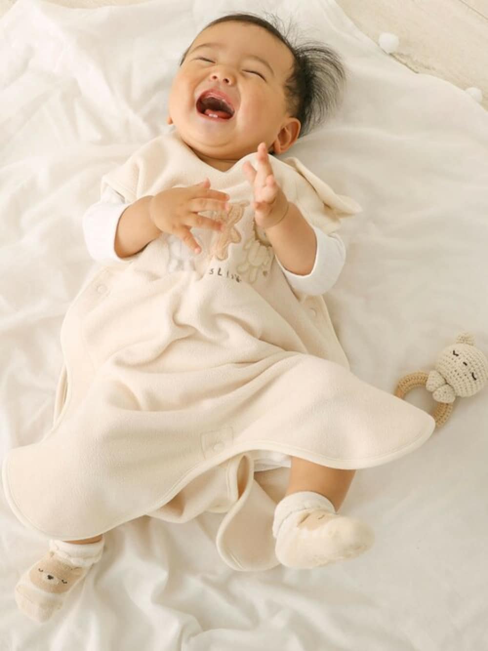 フリース素材を使用したスリーパーを合わせたおうち時間にピッタリなリラックスコーデ。 フロント部分にほどこしたアニマルのパッチ刺しゅうや配色のパイピングがアクセントになっています。 ポコポコ立体感のあるアニマルたちがキュートなポイント。 スヤスヤ眠るウサギ、クマ、ライオンたちと一緒に赤ちゃんもおねんね・・・ フリースを使用しているので赤ちゃんも動きやすく、快適◎ スリーパー定番のサイドホックになっているので着脱もカンタンでママもニコニコ♪ 生まれたての頃はもちろん、大きくなってからは足を出して着用できるので長く活躍できるのがうれしいポイント。 スリーパーを着ておねんねすれば、動き回ってもお腹が出なくて安心! お布団替わりにもなって便利です◎ 赤ちゃんの快適な睡眠をサポートしてくれる優秀アイテムです。 【SLAP SLIP(スラップ スリップ)】 ~子どもの欲しいをカタチに~ ヨーロッパのこどものように 子どもらしい今しか着れないナチュラルなかわいさを提案 どこか上品で清楚感漂うフレンチカジュアルは いつものコーディネートをさりげなく格上げ