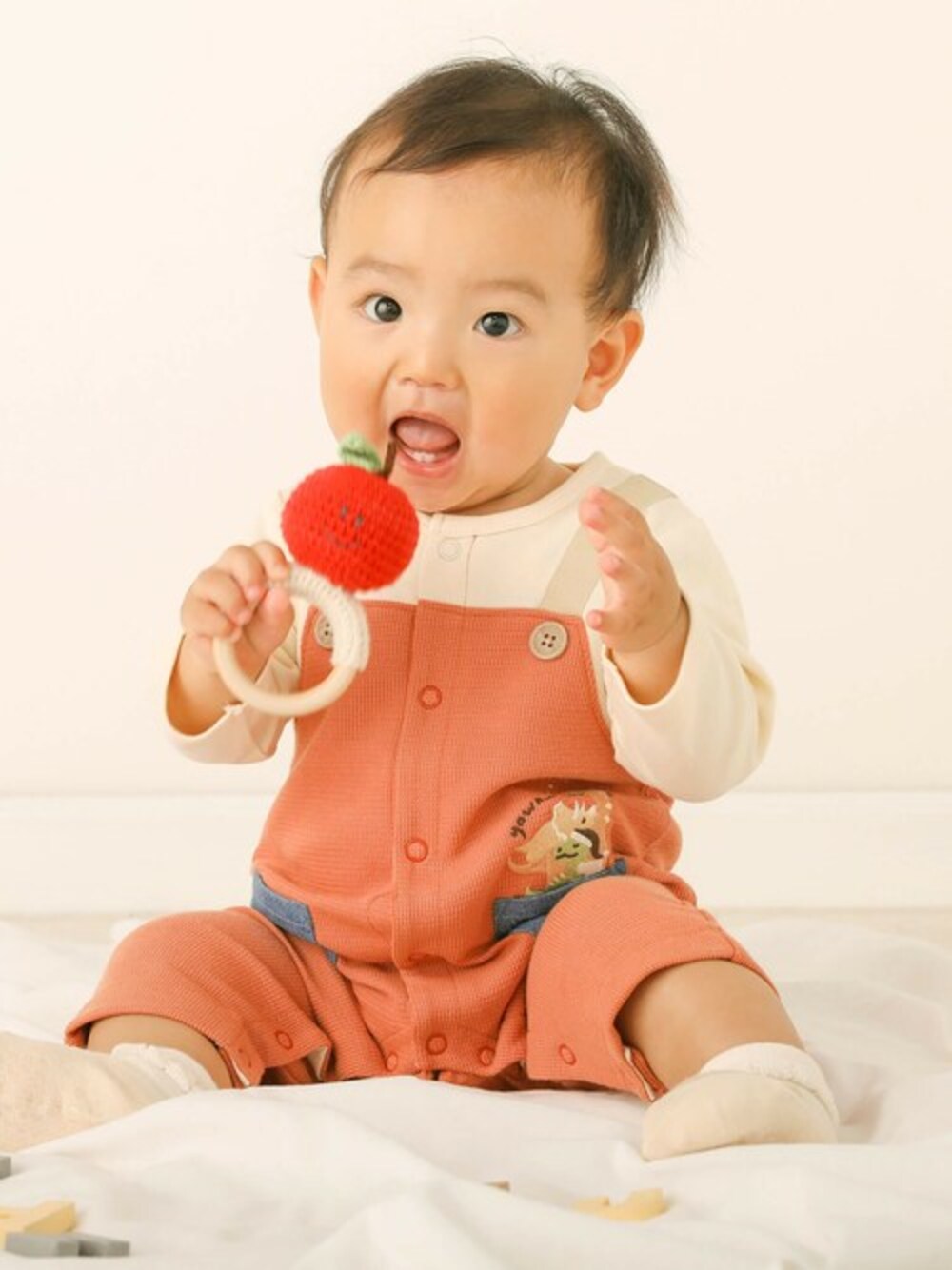 BEBE ONLINE STORE(BEBE ONLINE STORE)のロンパース「デニムポケット恐竜刺しゅうサロペットレイヤード風ロンパースベビー(60~80cm)」を使ったコーディネート