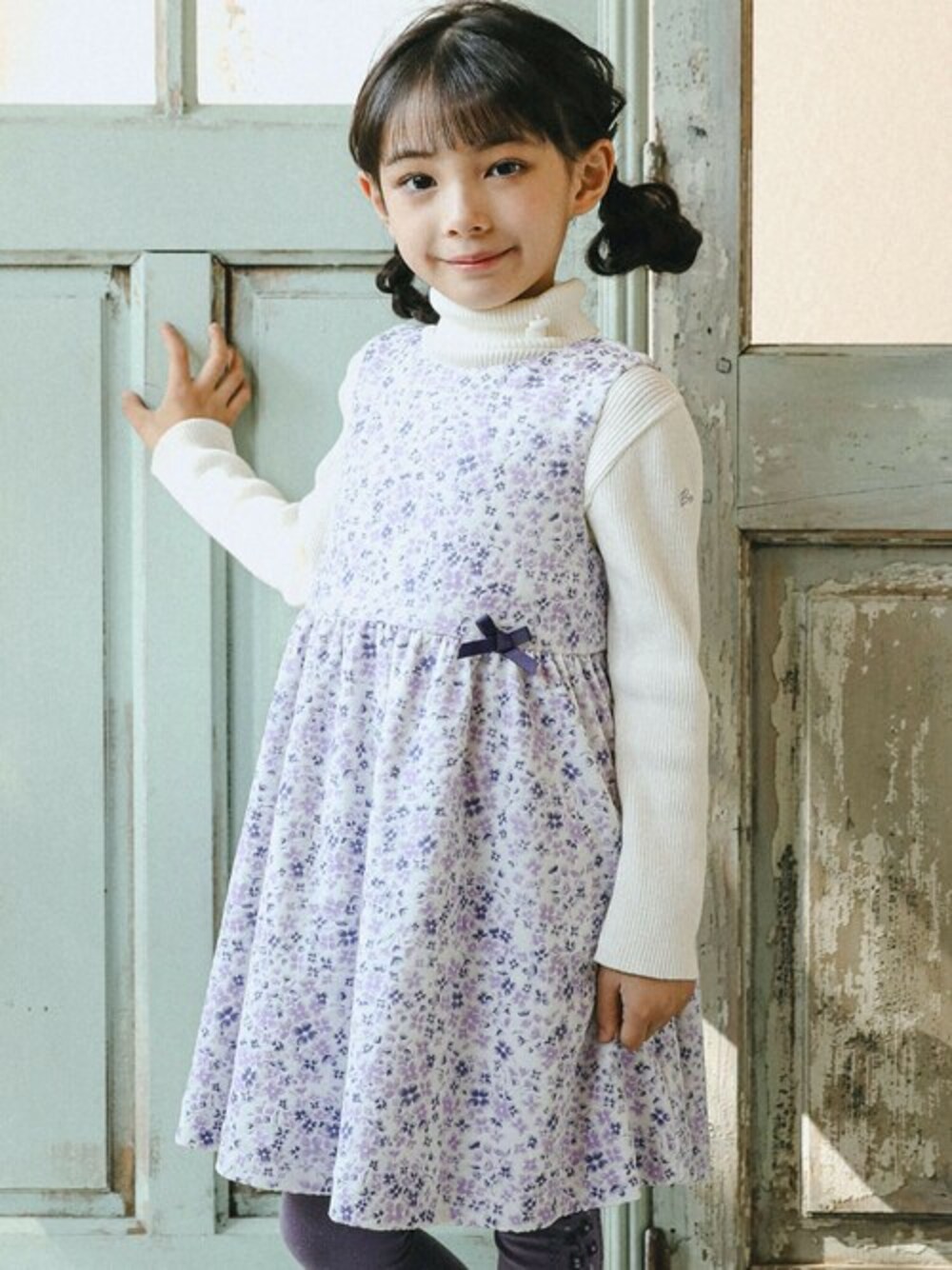 優しいタッチのオリジナルの花柄ファブリックを使用したワンピース。 ベロア調の起毛した素材感が秋冬シーズンにぴったりの1枚です。 インナーにホワイトのニットを合わせて冬らしさのあるやさしいコーディネートに。 濃淡のあるパープルの小花柄が映える色合いにまとまっています。 広がるスカートのシルエットとウエストのリボンが上品できれいな一着です。 【BeBe(べべ)】 ”LOVE MODERN” 少しおませで、生意気なヨーロピアンカジュアルの提案。 時代性・流行性をとらえ、ベーシックでもワンポイントを施した遊び心、楽しさを盛り込んでいます。 シンプルだけど、こだわりのあるオリジナリティーを重視しています。