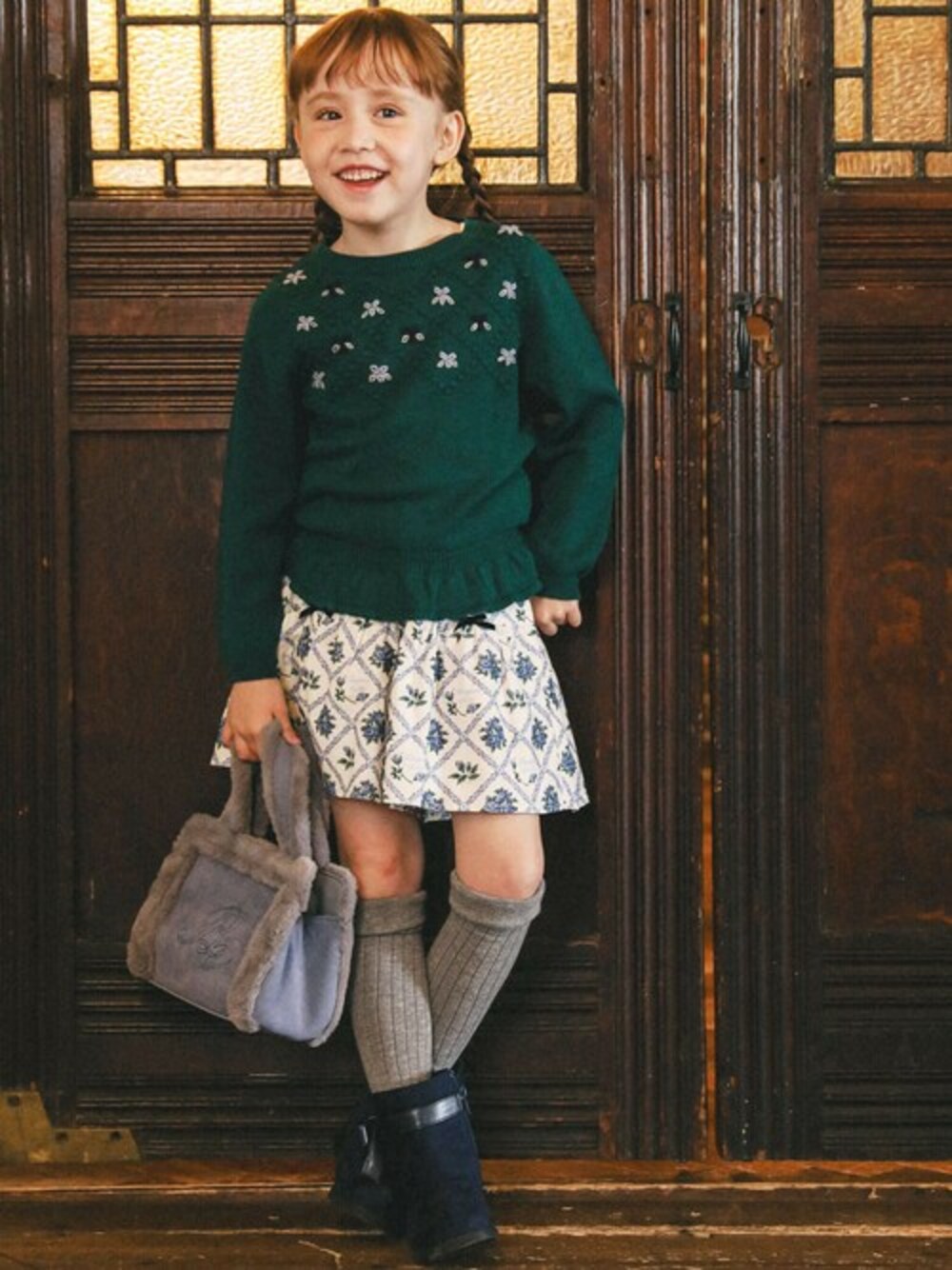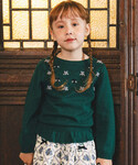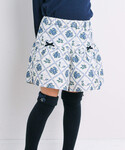 胸元にポコポコとした立体感のある編みが施されたニットプルオーバー。 編地の格子柄の中には刺繍で小さなお花を配置。 どこかレトロでかわいらしい雰囲気になっています。 ボトムには同じく格子柄と花柄を組み合わせたBeBeオリジナルのプリントファブリックのキュロット。 テーマとなっているパティシエをイメージしたかわいらしいイメージのコーディネートです。