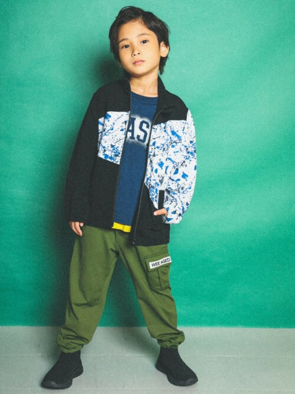 個性たっぷりのペンキを飛ばしたようなプリントが印象的な切替ジャケットに、 ミリタリー間のあるカーキ色のパンツを合わせたカジュアル感たっぷりなコーディネート。 インナーにはネイビーのTシャツを合わせ大人っぽくまとめています。 ストレッチの効いたジャージのアウターは通学にも使いやすさバツグン。 アクティブな男の子にぴったりなコーディネートです。 【 WASK(ワスク)】 WEEAGEDSAUCYKID「我々は小生意気な子供である・・・」 自由で遊び心満載な男の子たちへ アメリカンテイストをベースにその時々のトレンドや異なる要素をプラス エッジの効いたカジュアルスタイルをキッズウェアで表現