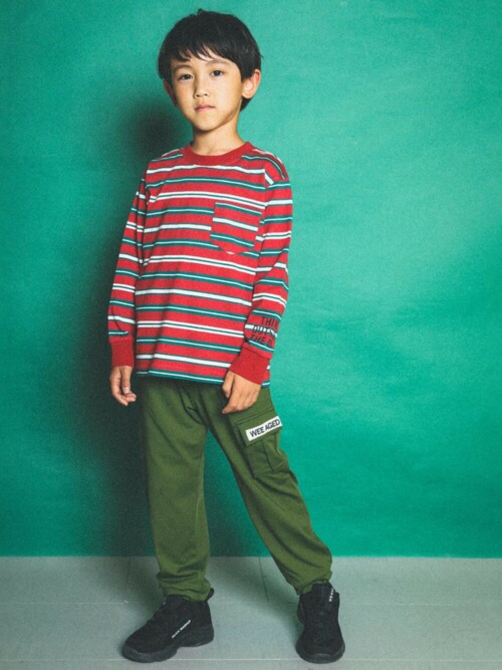 ランダムボーダーのTシャツに、ボーダーの中のカラーとリンクしたカーキ色のパンツ。 シンプルな組み合わせながらもまとまった色合いが大人っぽく見せてくれます。 Tシャツの袖に入ったロゴプリントや、ボトムのポケットデザインなど細かなデザインまでこだわっています。 上下ともにやわらかさと伸縮性のある素材でアクティブシーンでも活躍するコーデ。 スポーツやダンスをしているお子様におすすめです。 【 WASK(ワスク)】 WEEAGEDSAUCYKID「我々は小生意気な子供である・・・」 自由で遊び心満載な男の子たちへ アメリカンテイストをベースにその時々のトレンドや異なる要素をプラス エッジの効いたカジュアルスタイルをキッズウェアで表現