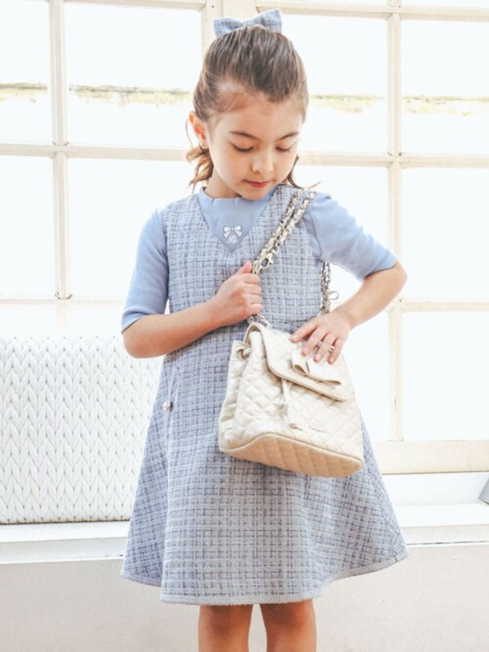 きらきらのラメが入ったツイード生地を使用したジャンパースカート。 浅めのVネックやポケットのパールボタン使いがレディライクな1着です。 重たくならずすっきり着こなせるフレアを入れたキレイなAラインのシルエットもポイント。 インナーにはカラーを揃えたモックネックのTシャツを合わせてすっきりと上品なコーディネートに。 大人っぽさのあるキルティングBAGがおしゃれ♪ 【2月GIRL Collection】 - シャンゼリゼでショッピング - シャンゼリゼ通りでのショッピングをイメージしたコレクション。 シャンゼリゼ通りとその周辺は、今のファッショントレンドが一目で分かるおしゃれスポット。 クラシカルな素材を春らしい爽やかなカラーで取り入れたレディライクなスタイリングを提案。 【BeBe(べべ)】 ”LOVE MODERN” 少しおませで、生意気なヨーロピアンカジュアルの提案。 時代性・流行性をとらえ、ベーシックでもワンポイントを施した遊び心、楽しさを盛り込んでいます。 シンプルだけど、こだわりのあるオリジナリティーを重視しています。