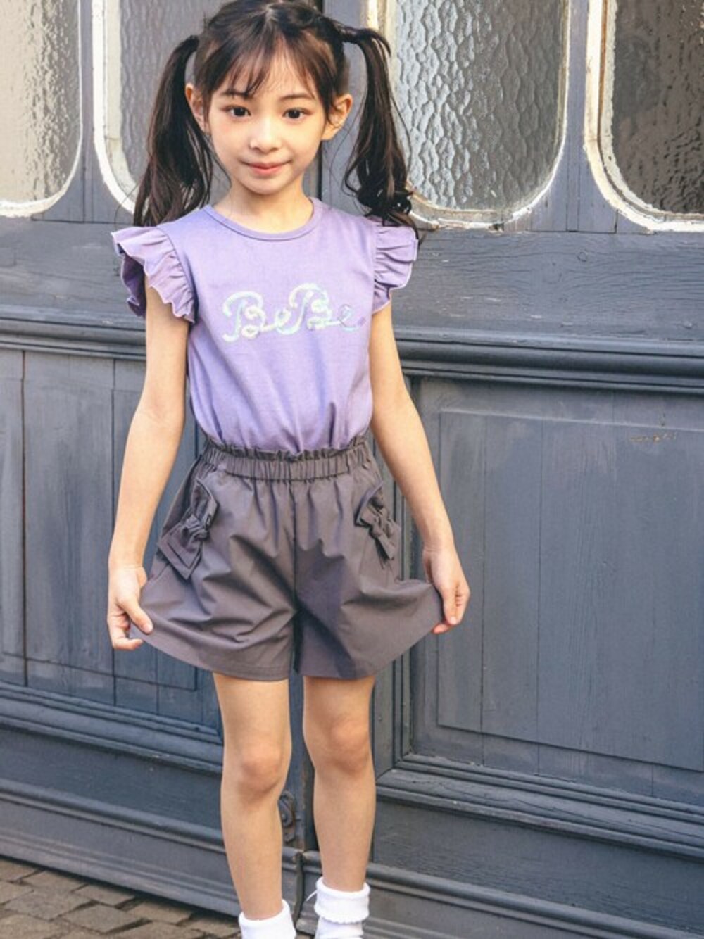 スパンコール刺しゅうでBeBeのロゴを表現した人気のTシャツにリボンモチーフのショートパンツを合わせた夏コーデ。 胸元のスパンコールは角度によって色が変わって見えるものを使用。 オーロラのような輝きが華やかです。 夏らしさのある爽やかで可愛らしいスタイリングです。 【3月 Collection】 Allons au cirque - サーカスを見に行こう - サーカスをイメージしたコレクション。 トレンドのドット柄を取り入れて、シルエットや切替が目を引くスタイリングで提案。 軽やかで構築的なシルエットや、大胆な柄づかいで サーカスの楽しさを表現。 【BeBe(べべ)】 ”LOVE MODERN” 少しおませで、生意気なヨーロピアンカジュアルの提案。 時代性・流行性をとらえ、ベーシックでもワンポイントを施した遊び心、楽しさを盛り込んでいます。 シンプルだけど、こだわりのあるオリジナリティーを重視しています。