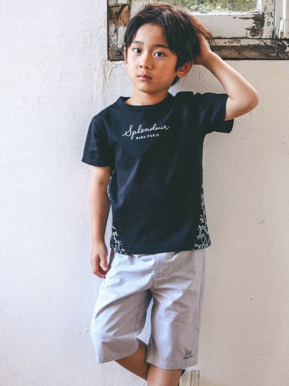 BeBeらしさいっぱい、モノトーンの中にデザイン性を取り入れた大人っぽいコーディネート。 Tシャツの手描きタッチのロゴ柄にはピクニックにまつわる言葉(芝生・バスケット・お菓子など)が書かれています。 程よいハリと肌当たりの柔らかさが心地よいポンチ素材を使用した半袖Tシャツは、斜めの切り替えで腰回りが引き締まって見えておしゃれです。 【3月 Collection】 Jardin du Luxembourg - リュクサンブール公園でピクニック - 青い空と心地よい風を感じながらピクニック。 美しい花々や鮮やかな木々が並ぶ広大なリュクサンブール公園はパリジャン・パリジェンヌ達の憩いの場。 爽やかなカラーの花柄にノスタルジックなギンガムチェックを合わせた、リラックス感あるロマンティックスタイル。 【BeBe(べべ)】 ”LOVE MODERN” 少しおませで、生意気なヨーロピアンカジュアルの提案。 時代性・流行性をとらえ、ベーシックでもワンポイントを施した遊び心、楽しさを盛り込んでいます。 シンプルだけど、こだわりのあるオリジナリティーを重視しています。