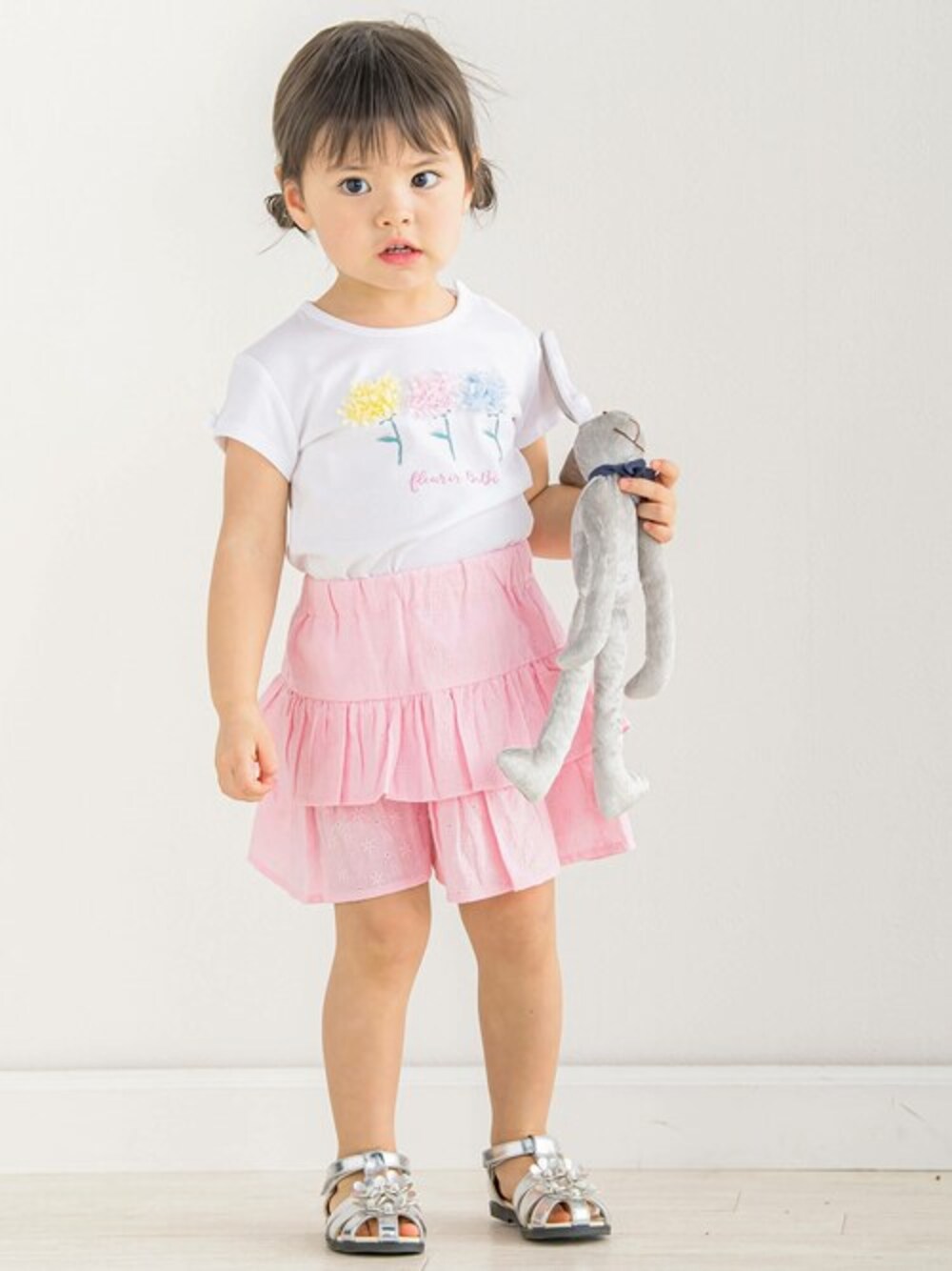 立体的なシフォンのお花モチーフの半袖Tシャツ+かわいいレースのフリルが重なったキュロットパンツ。 Tシャツの胸元にはイエロー・ピンク・ブルーの3色のお花が並んで、ベビーのかわいらしさを引き立ててくれます。 女の子らしく華やかさもありデイリーにも着やすい組み合わせはギフトにもぴったりです。 【4月 Collection】 Le Jardin des Plantes de Paris-パリ植物園を探検- パリ植物園は動物園や自然史博物館も併設した広大な庭園。 その中にある大温室では実際に熱帯雨林のジャングルに来たかのような大迫力の植物を楽しめます。 南国の花や木々、葉っぱ、動物たちをデザインに落とし込んだリラックスムード溢れるコレクション。 【BeBe(べべ)】 ”LOVE MODERN” 少しおませで、生意気なヨーロピアンカジュアルの提案。 時代性・流行性をとらえ、ベーシックでもワンポイントを施した遊び心、楽しさを盛り込んでいます。 シンプルだけど、こだわりのあるオリジナリティーを重視しています。