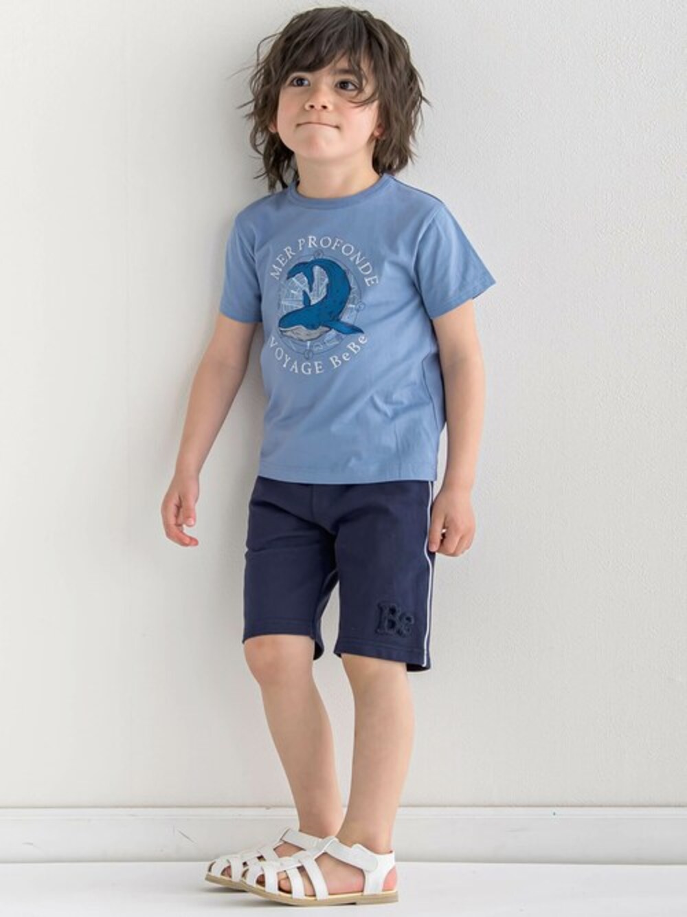 夏にうれしい吸水速乾素材を使用したクジラのプリントの半袖Tシャツ。 フロントには羅針盤に乗ったクジラをプリントし、その周りにロゴ刺しゅうを配置。 バックにはフランスの地図をパッチで表現。 ボトムにはミニ裏毛のスウェットパンツ。 元気いっぱい使えるアクティブ感のあるコーディネートです。 【5月 Collection】 Croisière en vacances -サマークルーズ- バカンスは南仏の町を巡るサマークルーズへ! 青い空と海を満喫できる、開放的な船旅をイメージしたコレクション。 クリアなブルーとマリンテイストが爽やかな印象に。 【BeBe(べべ)】 ”LOVE MODERN” 少しおませで、生意気なヨーロピアンカジュアルの提案。 時代性・流行性をとらえ、ベーシックでもワンポイントを施した遊び心、楽しさを盛り込んでいます。 シンプルだけど、こだわりのあるオリジナリティーを重視しています。
