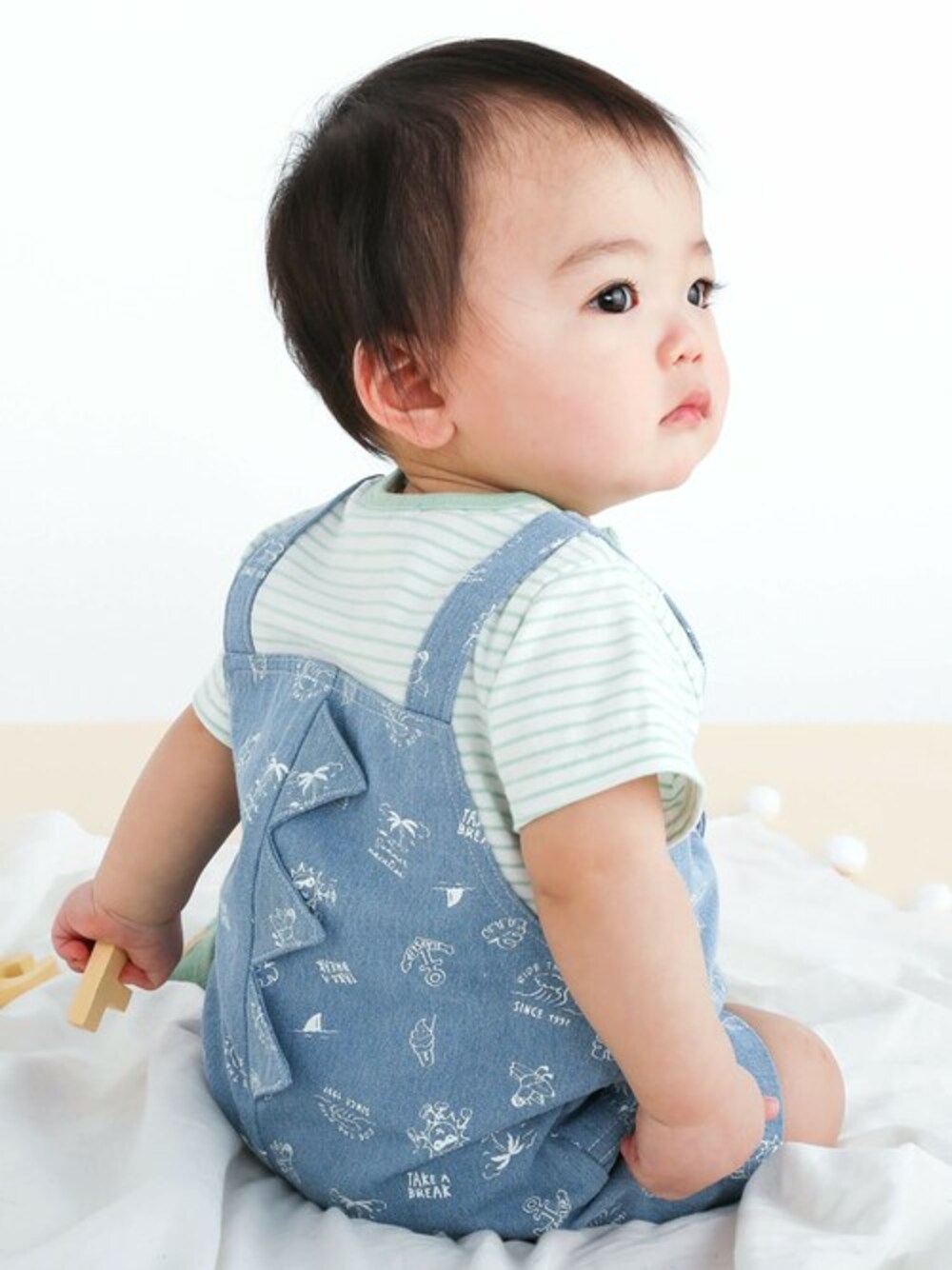 Tシャツとデニムのサロペットを重ね着したようなデザインがオシャレな半袖ロンパース。 ネイビー:マルチボーダーのTシャツに無地のネイビーサロペット ブルー系:淡いグリーンとオフホワイトのTシャツにサングラスをかけてウキウキな太陽や錨、ヤシの木など、夏らしいアイテムを集めたプリント柄のサロペット。 お兄ちゃんが着ているみたいなサロペットでベビーもウキウキ。 男の子が大好きな恐竜の背びれが後ろについているから座った時やハイハイしたときの後ろ姿がとってもキュート◎ スナップボタンで全開になるので、首が座る前の赤ちゃんに着せやすく、新米ママにもおすすめ! 股下にもスナップが付いていて、足をバタバタしてもはだけにくく、オムツ替えもラクラクな設計になっています。 ブルー系は同じプリント生地を使用したお兄ちゃんサイズのハーフパンツ(1810-63256)も展開しているのでさりげないお揃いコーデもおすすめ◎ ※脇ポケットあり。 ※柄の出方は生地の裁断により一点一点異なります。 2024年春夏男の子アイテム。 【SLAP SLIP(スラップ スリップ)】 ~子どもの欲しいをカタチに~ ヨーロッパのこどものように 子どもらしい今しか着れないナチュラルなかわいさを提案 どこか上品で清楚感漂うフレンチカジュアルは いつものコーディネートをさりげなく格上げ