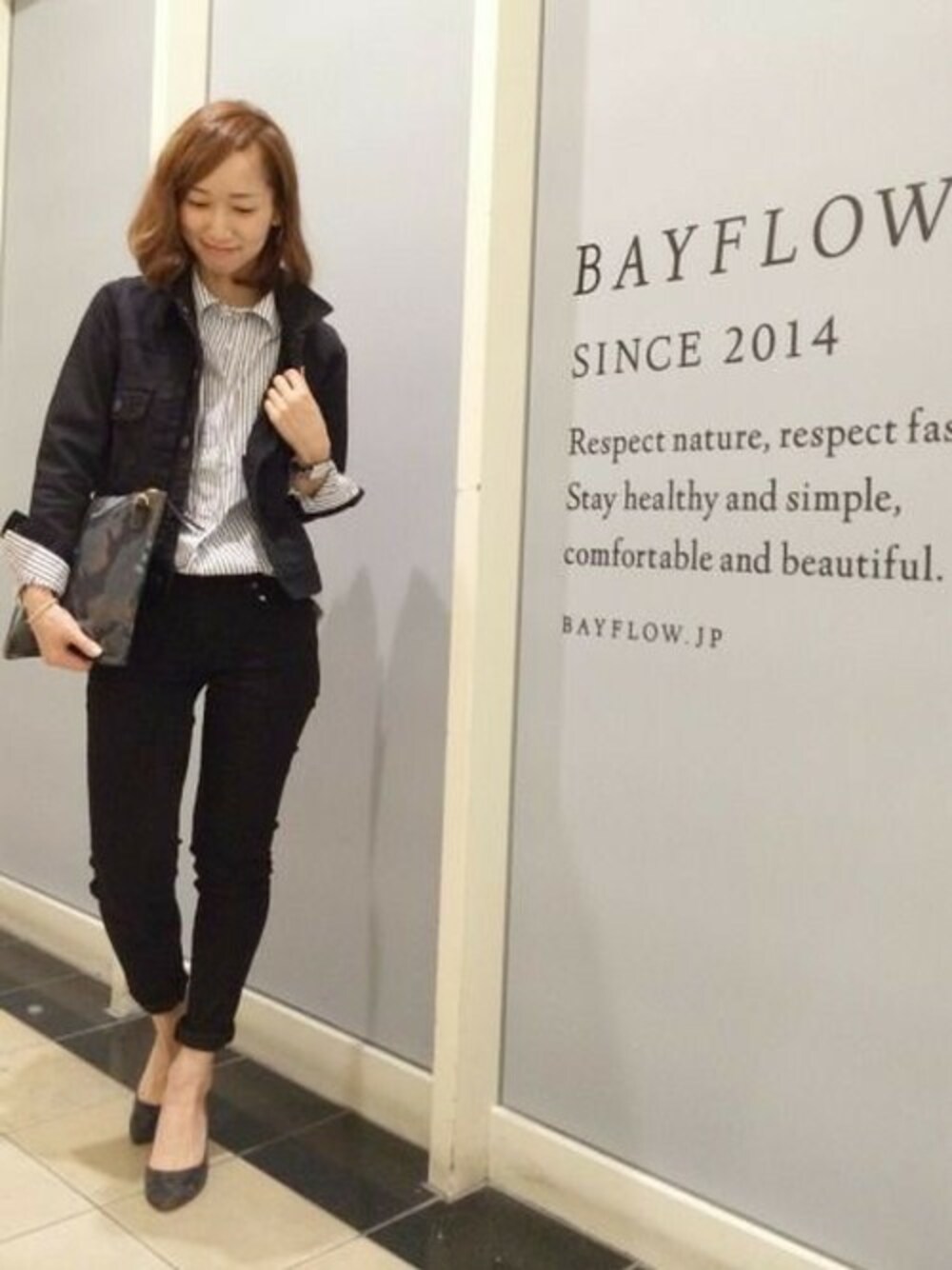 秋のマストアイテム、Gジャン×スキニーでデニムonデニムスタイル。 ストライプシャツ、ヒール共にモノトーンカラーで合わせ、女性らしさをプラスしています。