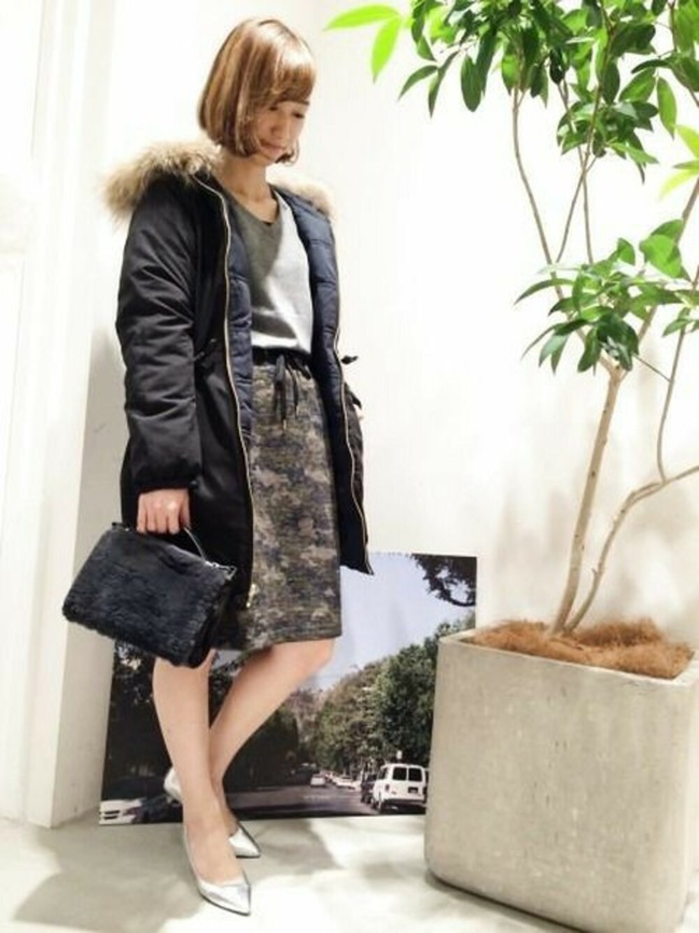 人気のリバーシブルダウン入荷いたしました! ダウンはとても暖かいので、ニットは薄手をチョイス。 カモスカートメインにブラック・グレーのモノトーン合わせで、 小物はヒールパンプスとファーBAGで女性らしさを出した大人スタイリングです。