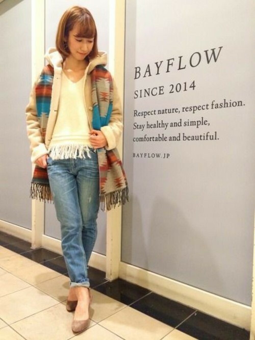 新作のフリンジトップスをメインにネオボヘミアンをテーマにスタイリングしました。 ボトムはボーイフレンドデニムで抜け感を出しつつ、足元はヒールでレディな仕上がりに。 ベイフローらしいショアなコーディネートです。