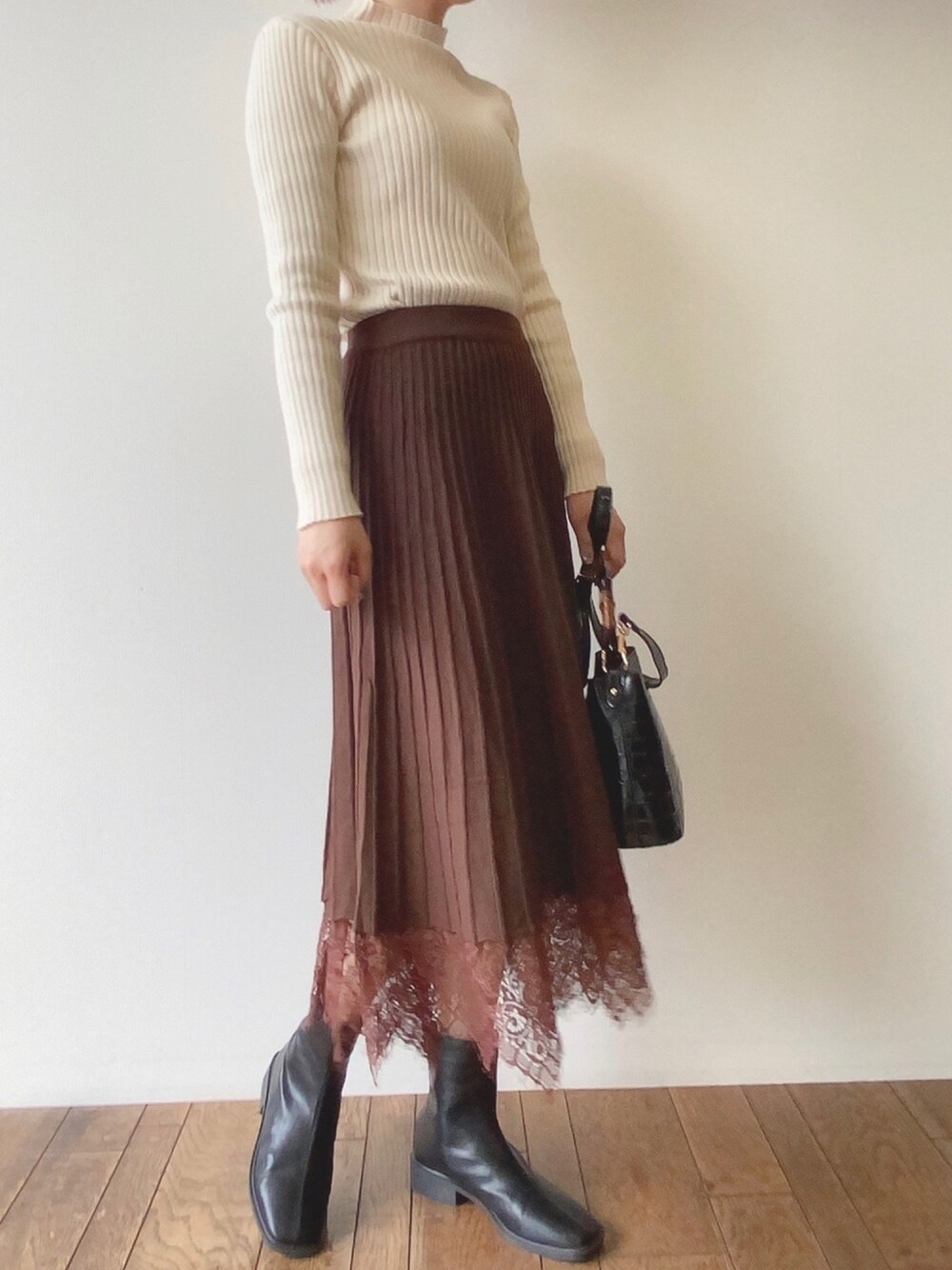BLUEEASTのスカート「裾レースプリーツニットスカート」を使ったコーディネート