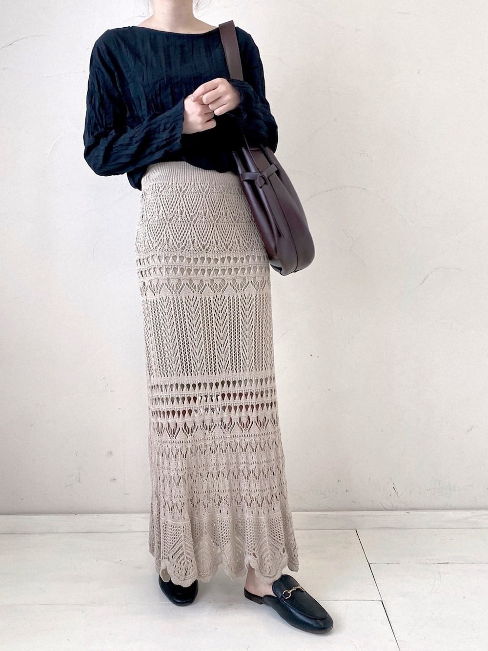 BLUEEASTのスカート「クロシェ編みロングスカート」を使ったコーディネート