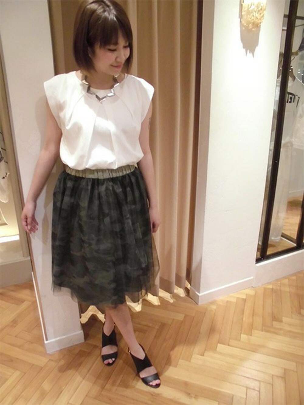 光沢のあるキレイめのブラウスに、今年人気のチュールのスカートを合わせて 上品な印象に♪ カモフラ柄のチュールスカートは新鮮で、ふわっと広がるフレア感は◎