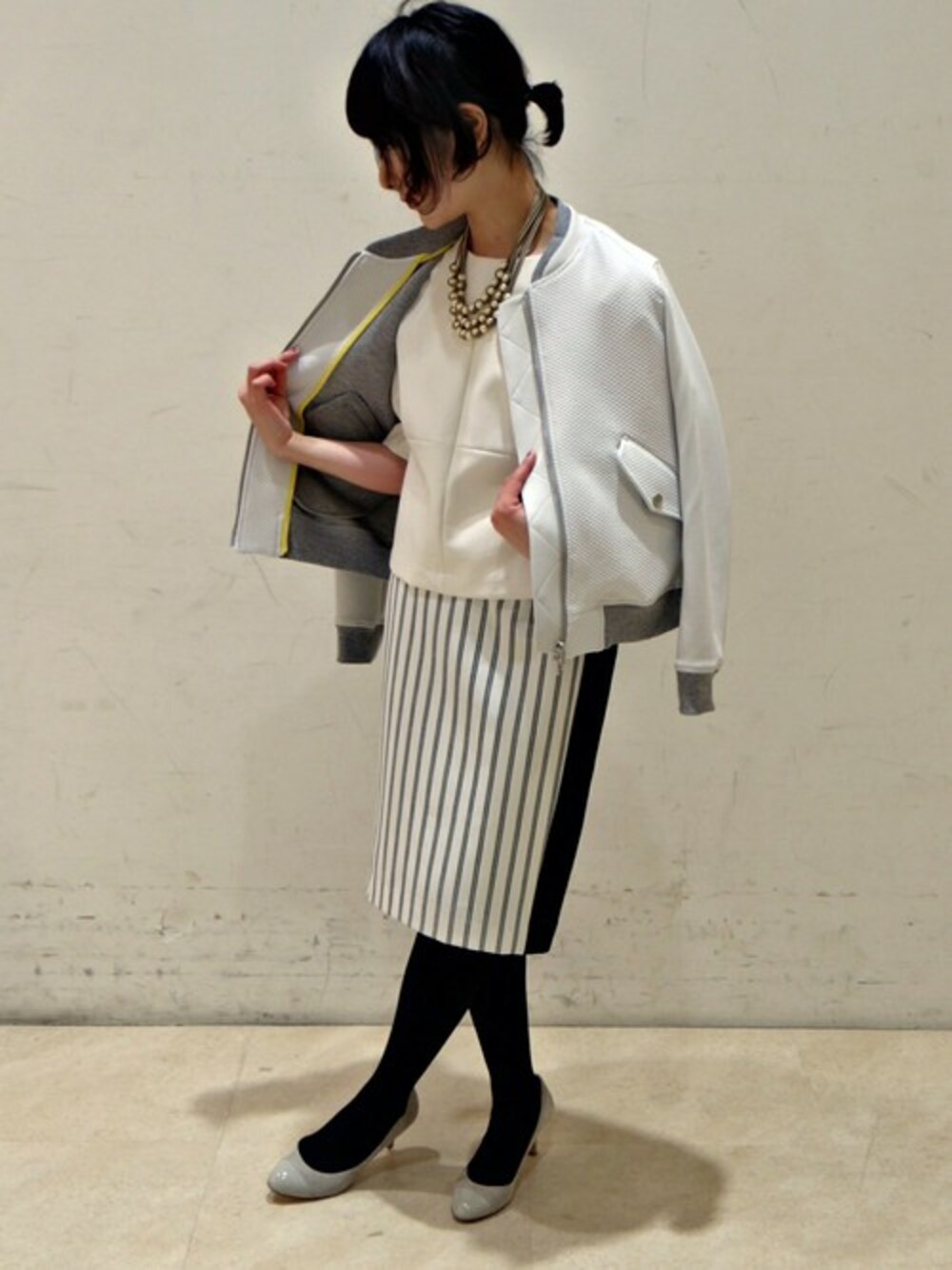 春トレンドのストライプをアクセントに効かせた、ホワイトのワントーンコーディネイト。<br> きれいめなスタイリングにブルゾンを羽織ることで、カジュアルさをプラスしたこなれ感のある仕上がりに。