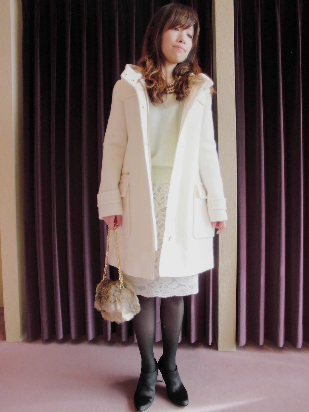 レーススカートにグリーンのニットのコーディネイトです。 アウターはバビロンおすすめの圧縮ブークレーコートを合わせました。 とても柔らかくフェミニンな素材感になっています。 少し前を開けても可愛らしいです。