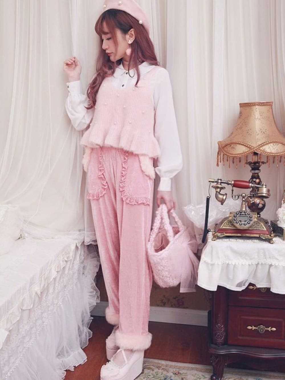🌟2017 Autumn/Winter New Collection🌟 シフォンブラウスに、 ふわふわでスウィートなモヘアニットビスチェと ベロアファーパンツでピンクコーデしてみました♪ ツイッター・インスタグラムはこちら🙏 Twitter:@Bobon21_japan Instagram:@bobon21_official