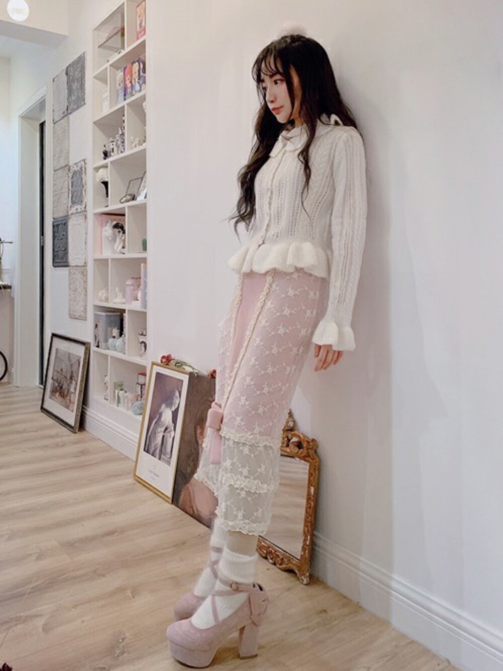 Bobon21のカーディガン/ボレロ「甘ガーリーフリルニットカーディガン -全2色-」を使ったコーディネート