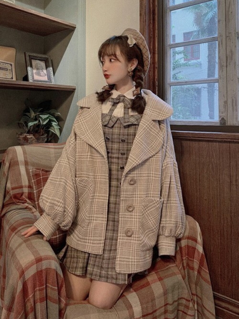 Bobon21のピーコート「千鳥柄ランタン袖BIGジャケット-全2色-」を使ったコーディネート