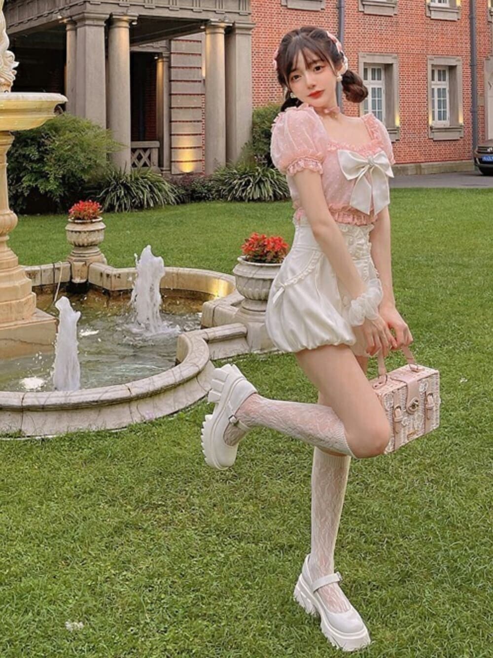 Bobon21のシャツ/ブラウス「BIGリボンドットシフォンショート丈トップス-全2色-」を使ったコーディネート