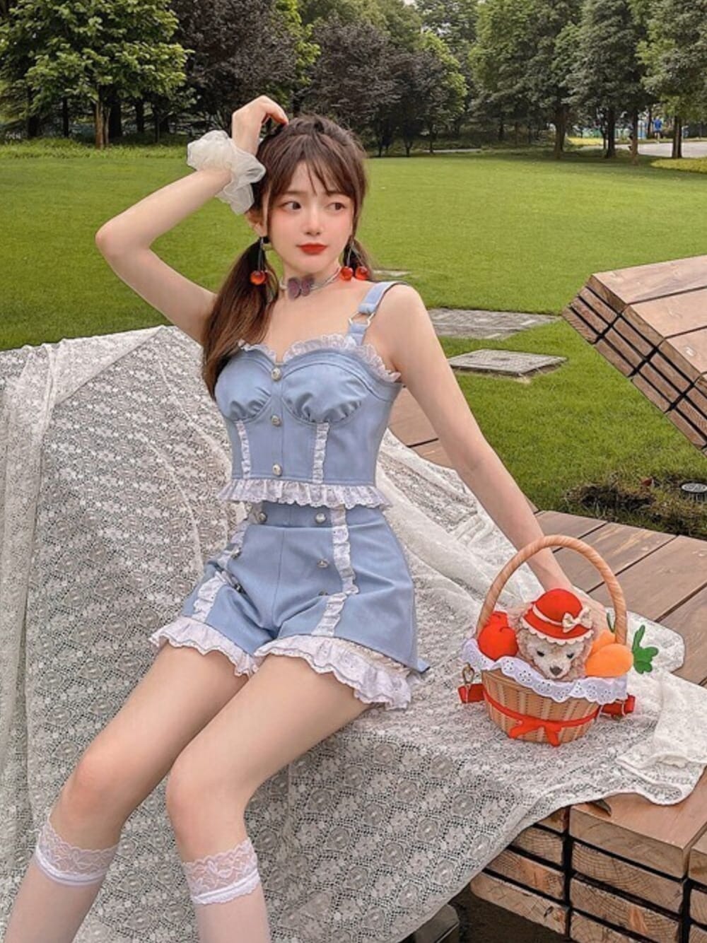 Bobon21のキャミソール「甘ガーリーコットンレースデニムビスチェ-全1色-」を使ったコーディネート