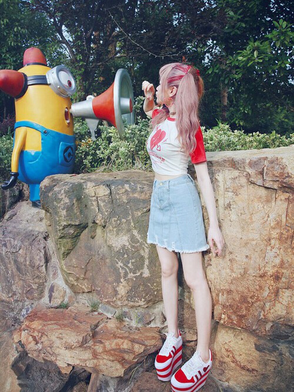 ♡Bobon21 2016 Summer New Collection♡ ❤︎赤×デニム×スニーカーでポップなガーリーコーデ❤︎ チビTはキュートな「Heartbreaker」シリーズ、伸縮性があり体にフィットする素材なので着心地GOOD★ ミニデニムは細かくカットされた生地を縫い合わせているので一味違うよ♪ ❤︎Accessories❤︎ 赤の厚底スニーカー、横にハートのデザイン ピアスも赤のハート 髪飾りは赤のリボン 今季トレンドのガーリー×スポーティコーデ♪