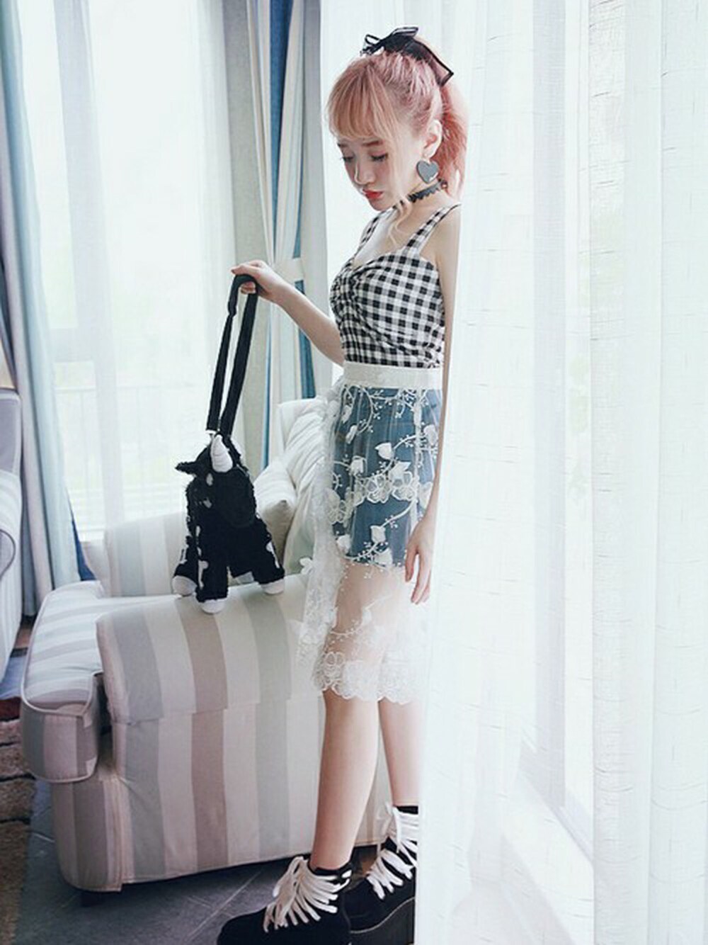 Bobon21のキャミソール「リボンデザインギンガムチェックビスチェ」を使ったコーディネート