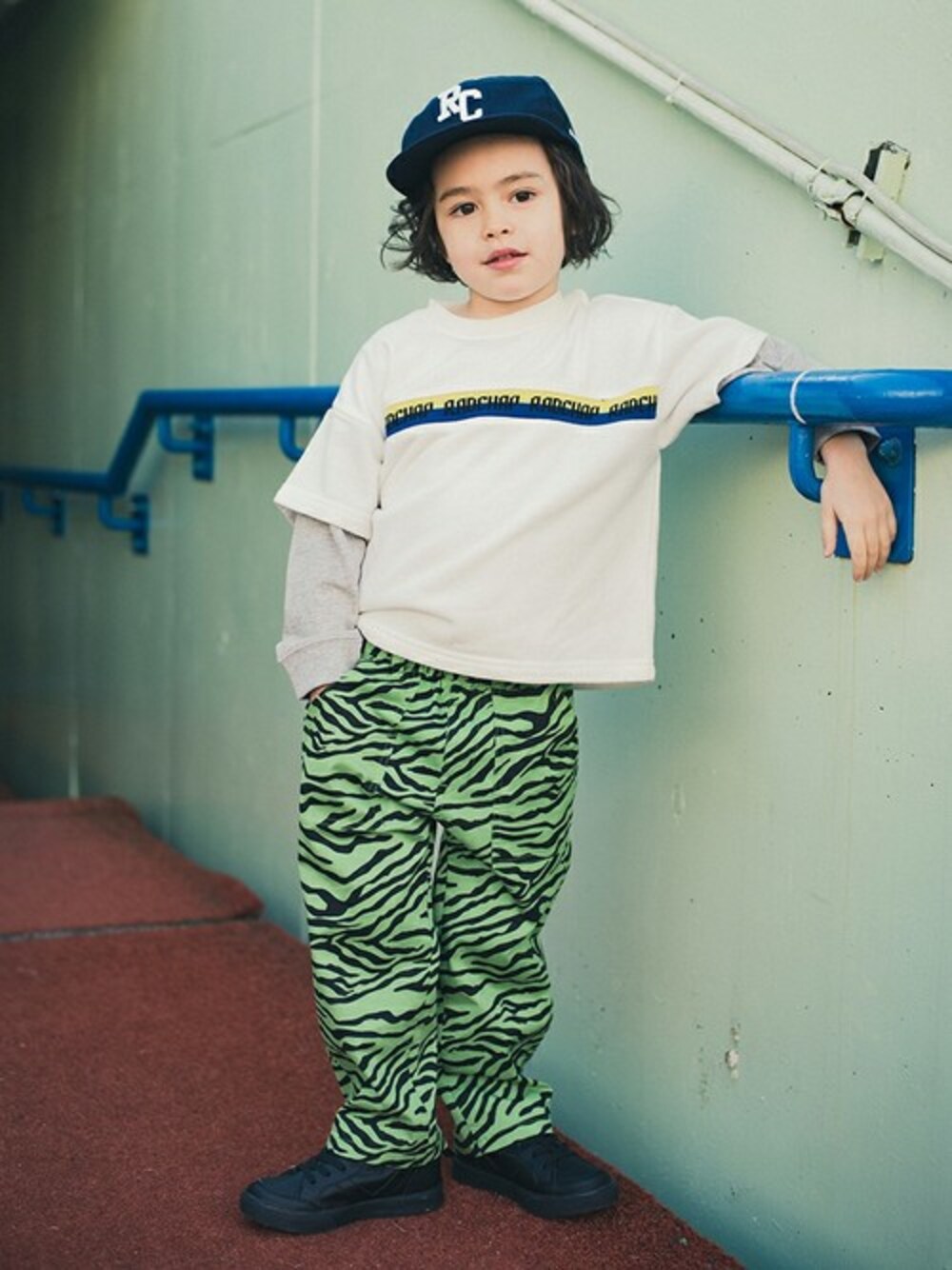 【RADCHAP】 ゼブラ柄ロングパンツ 春っぽいカラーリングなので リアル感なく取り入れやすい1枚。 トレーナーや薄手のロンT、Tシャツにも合わせやすい◎ 身長:107cm  着用:110cm