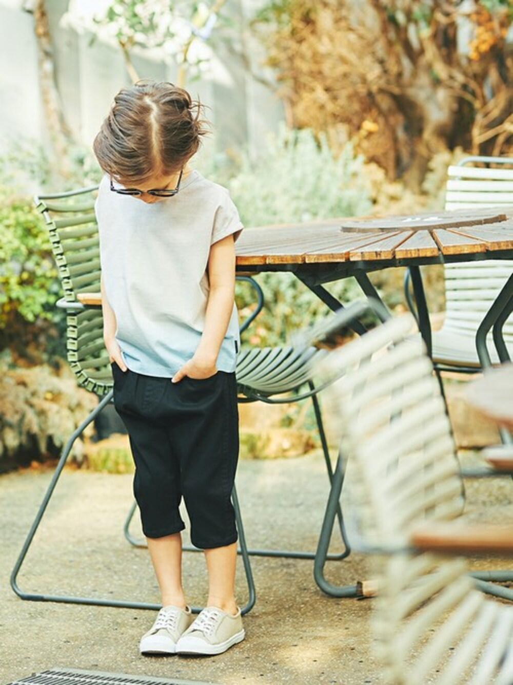 【branshes】 グラデーション染めタンクトップ くすんだベージュから淡いブルーのグラデーション フレンチっぽい袖のタンクトップなので 女の子にもおすすめです◎ カジュアル、モノトーンにも使える1枚です♪ 身長:113㎝ 着用:110cm、19㎝(シューズ)