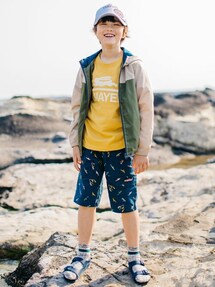【branshes】 モノトーンコーデ 女の子にも合わせやすい丈感のハーフパンツ 今年らしい柄の半袖シャツとの組み合わせは 色を合わせてモノトーンに仕上がります☆ 足元はスポーティなサンダルが◎ 身長:113㎝ 着用:110cm、19㎝(サンダル)